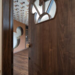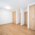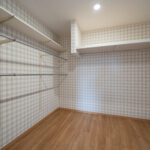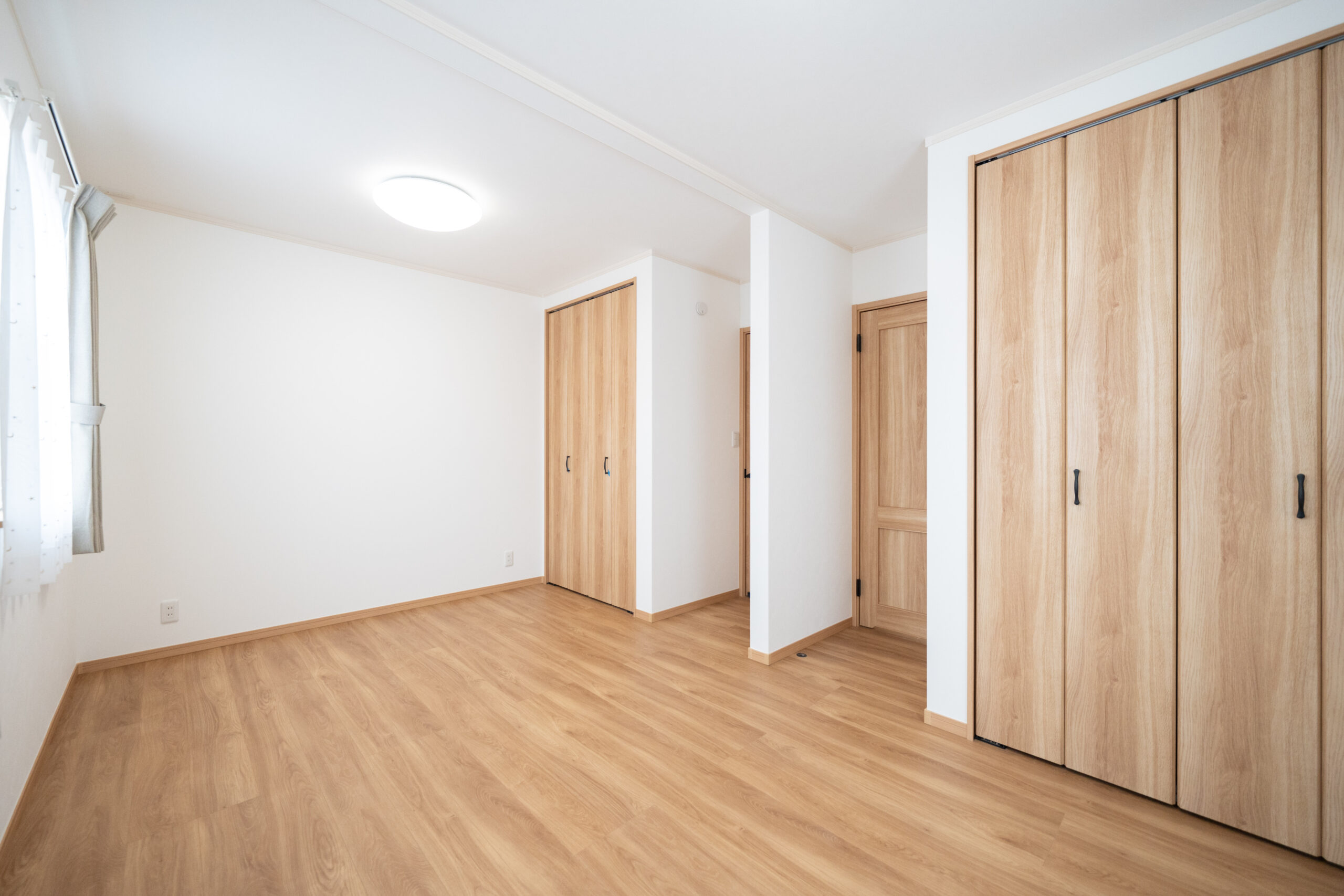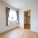 印象的な丸い窓がアクセントになった主寝室は、柔らかな光が差し込むやさしい空間。隣にはチェック柄のクロスがかわいいウォークインクローゼットを配置し、ホール側からもアクセス可能な回遊動線を採用しています。デザイン性と実用性を両立したプライベート空間です。