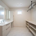 洗濯・乾燥・たたむ・収納が一箇所で完結する、理想のランドリールーム。広めのカウンターや収納棚、そしてゆったりとした幅広の洗面台も備えており、家族が並んで使える設計です。家事のしやすさを重視した空間で、毎日の暮らしにゆとりをもたらします。