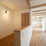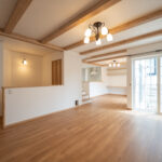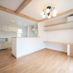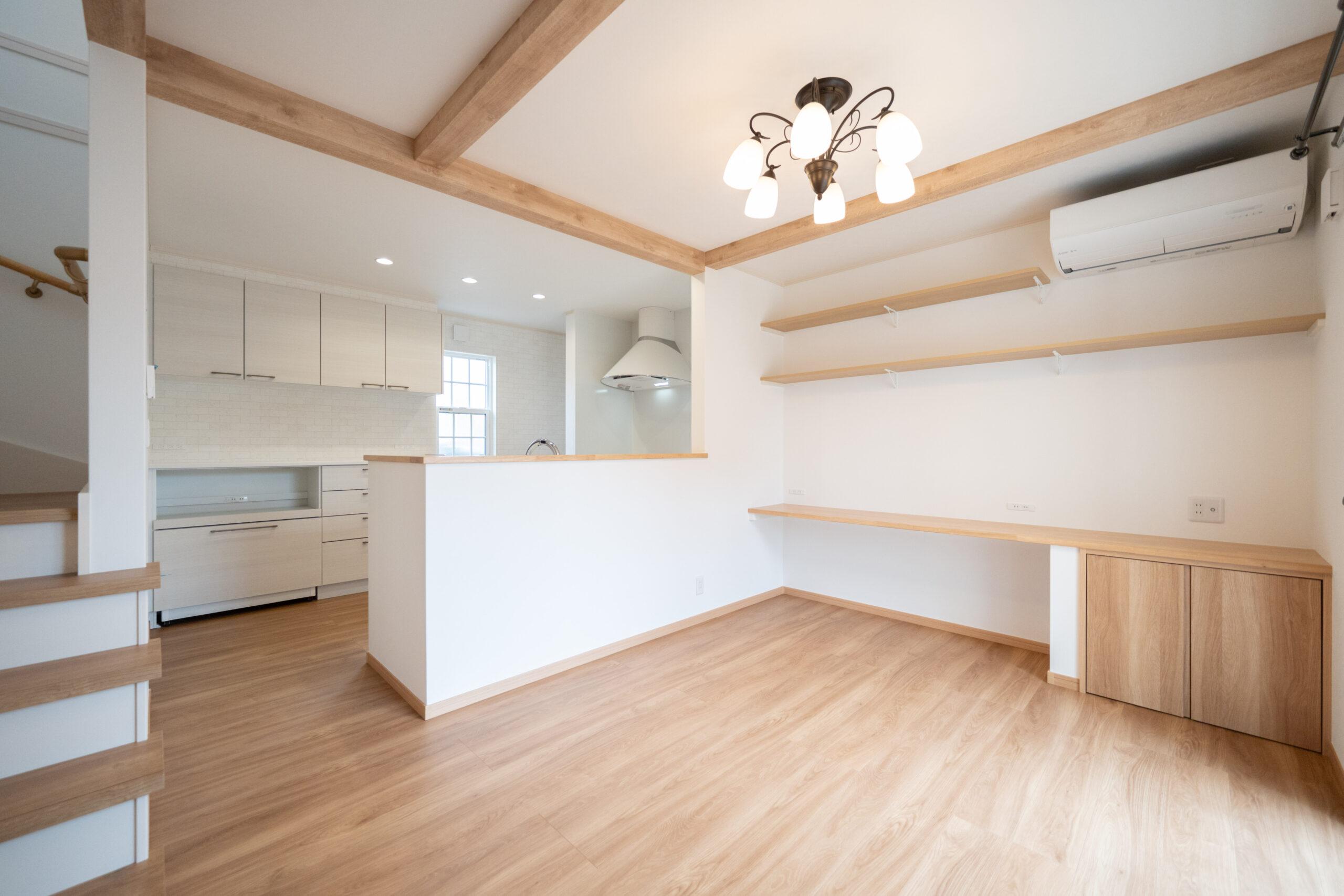 ナチュラルな木目のフローリングと化粧梁、そしてクラシカルなシャンデリアが調和したLDKは、まるで海外のお家のような可愛らしさ。明るく開放的な空間の中に、温かみのある落ち着いた雰囲気が漂います。リビング横には小さなペットスペースも備え、家族みんなが心地よく暮らせる工夫が詰まっています。