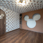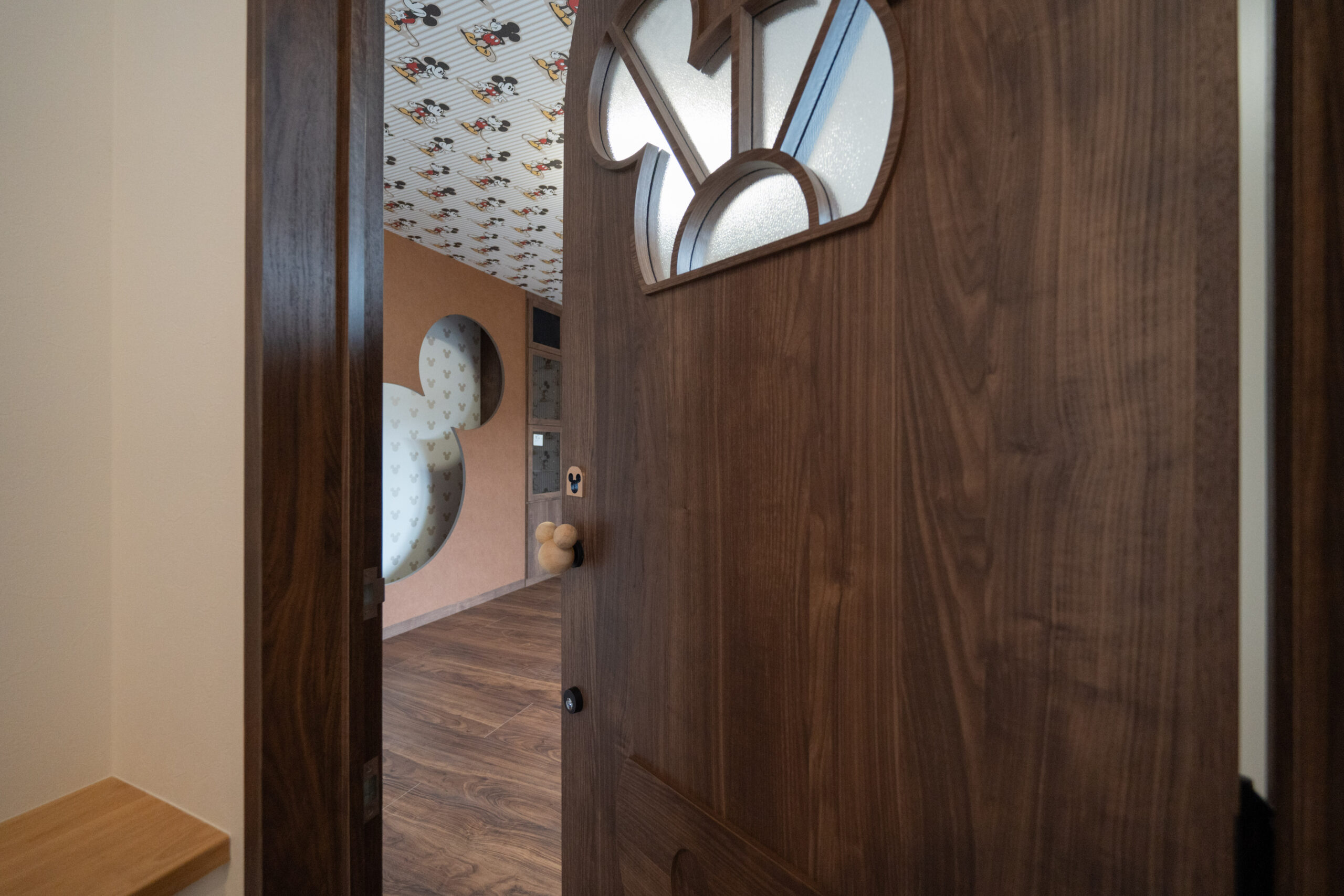 ディズニー好きにはたまらない、夢のようなホビールーム。造作のミッキーモチーフの扉を開けると、壁紙から照明、造作棚に至るまでディズニー一色のわくわく空間が広がります。ミッキー型の壁にはスクリーンとスピーカーを埋め込み、ホームシアターとしても楽しめる仕様に。好きな世界観にどっぷり浸れる、まさに夢の部屋です。