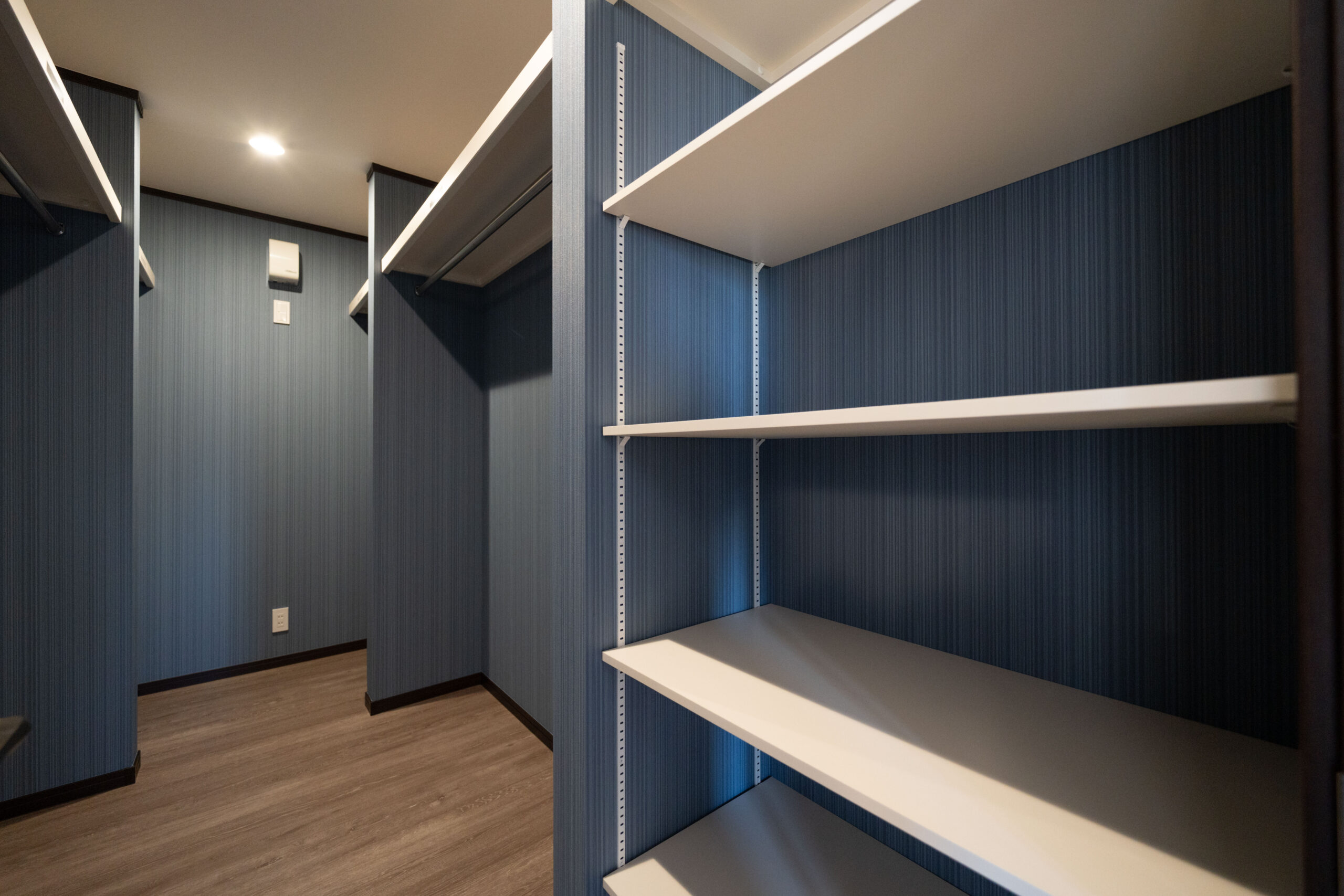 2階ホールからアクセスできるファミリークローゼットは、家族みんなの衣類や荷物をまとめて管理できる便利な収納空間。棚とハンガーパイプのバランスが良く、シーズンごとの入れ替えもスムーズです。