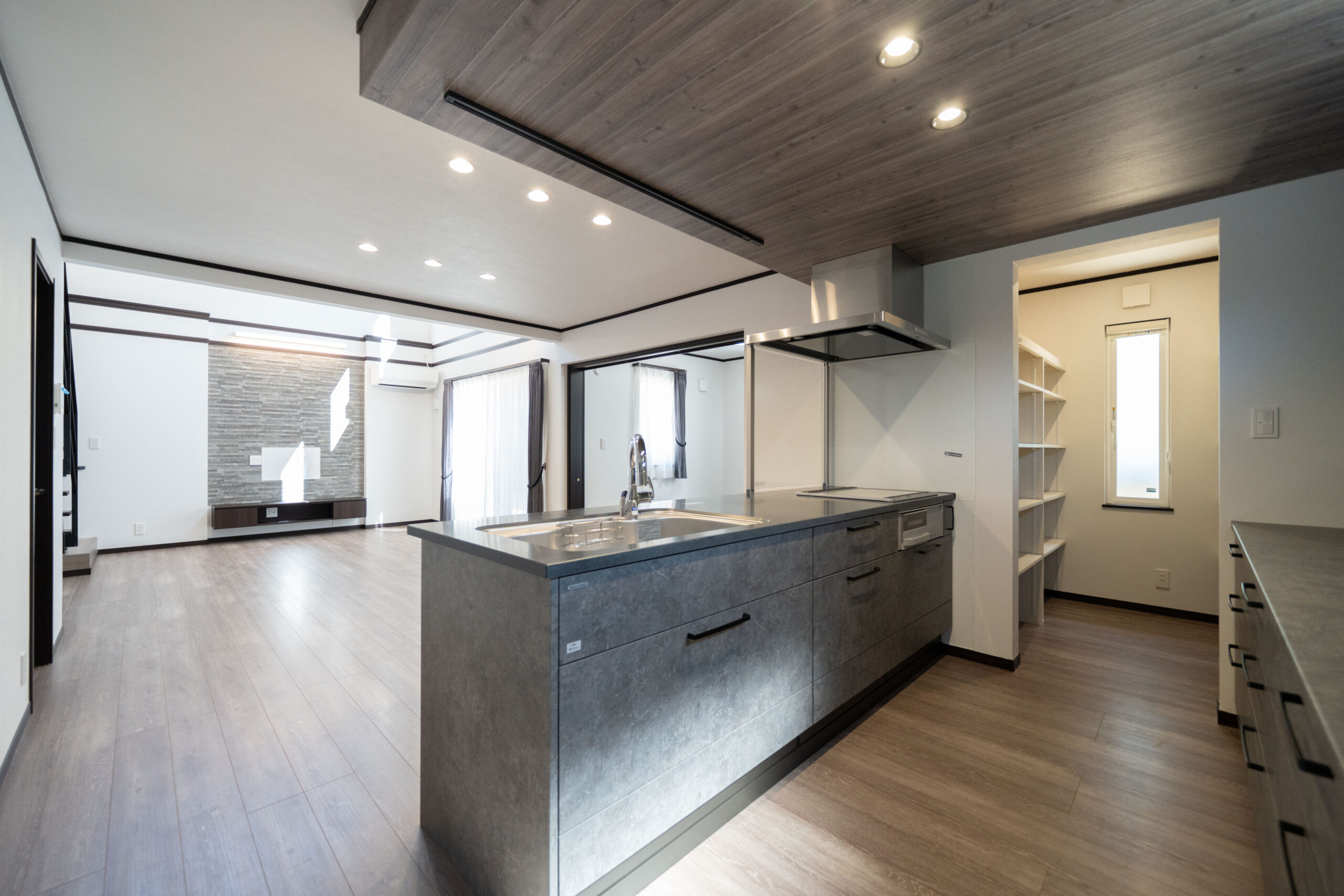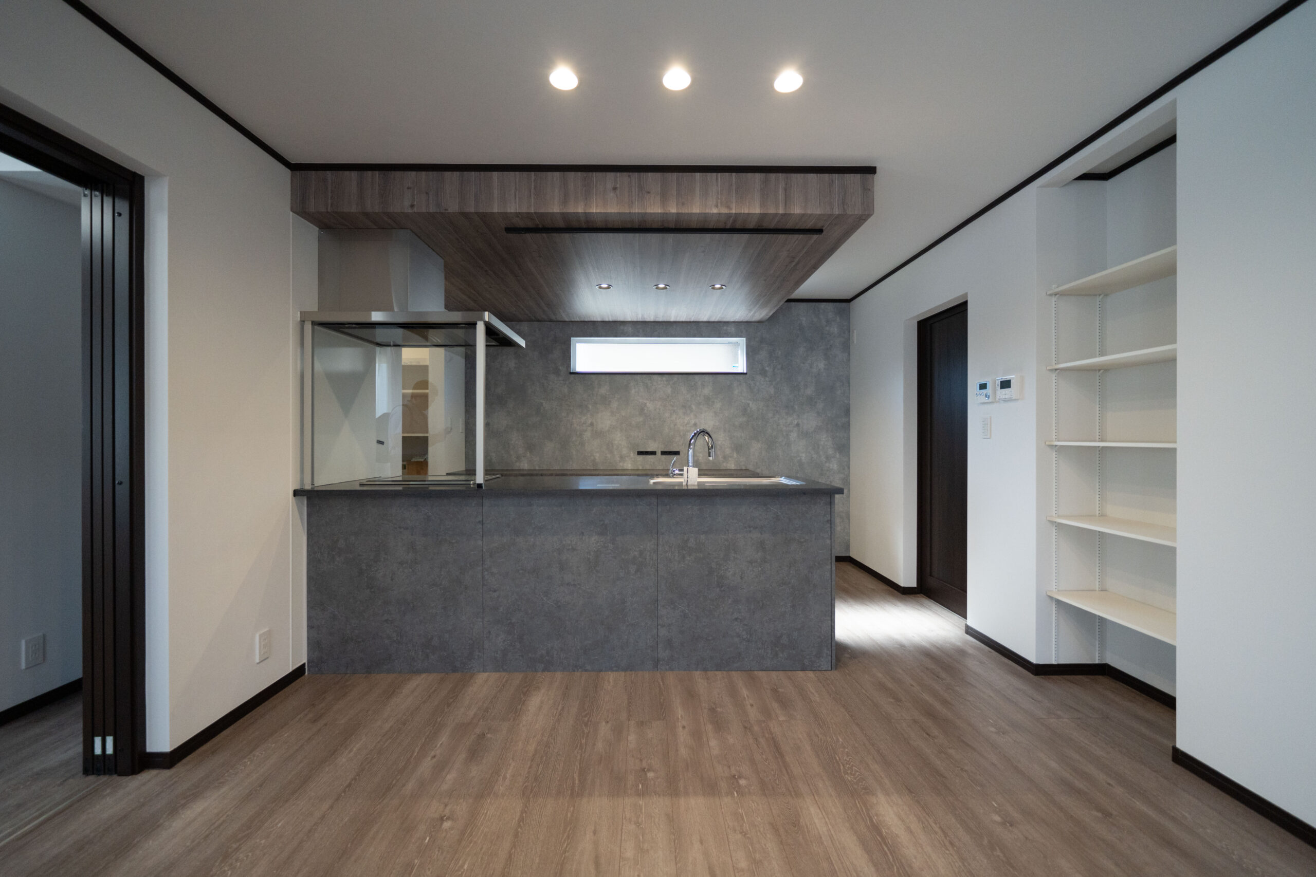 ペニンシュラ型のキッチンは、折り下げ天井で空間に奥行きと立体感を演出。リビング・ダイニングと緩やかにつながりながらも、天井や照明の変化でキッチンエリアがしっかりと際立ちます。背面にはブラックの収納と家電スペースを備え、生活感を抑えたすっきりとした印象に。
