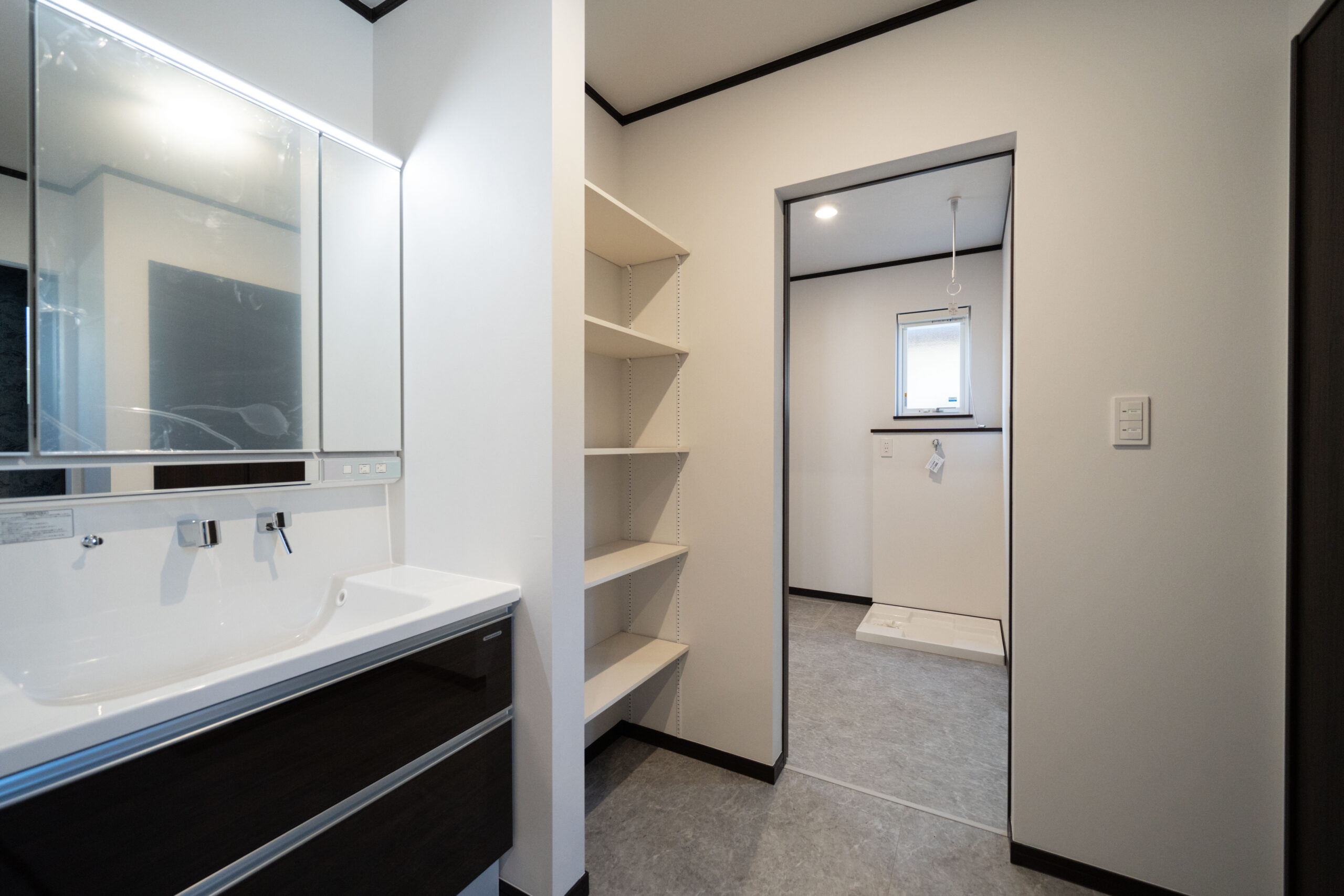 玄関から入ってすぐの位置に設けられた洗面スペースは、脱衣室とは独立したレイアウト。お客様も気兼ねなく使える動線設計で、手洗い習慣が自然と身に付きます。コンパクトながらも使い勝手の良さが光るスペースです。