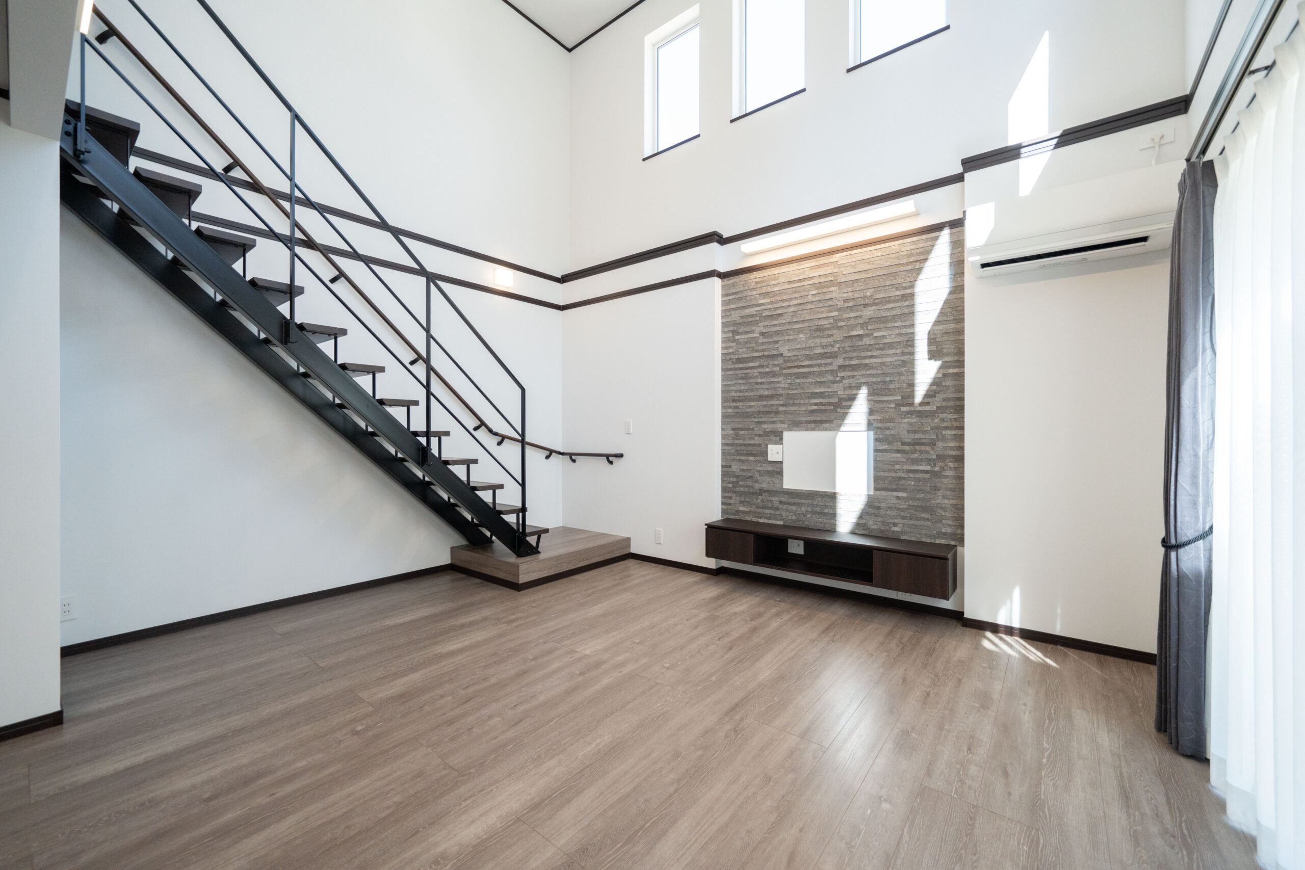 アイアンのリビング階段が印象的なLDKは、吹き抜けによる開放感と直線的なレイアウトが特徴です。空間全体を引き締めるダークトーンのラインや、壁掛けテレビスペースに施工されたエコカラットのアクセントが、シンプルモダンな雰囲気を際立たせています。