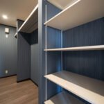 2階ホールからアクセスできるファミリークローゼットは、家族みんなの衣類や荷物をまとめて管理できる便利な収納空間。棚とハンガーパイプのバランスが良く、シーズンごとの入れ替えもスムーズです。