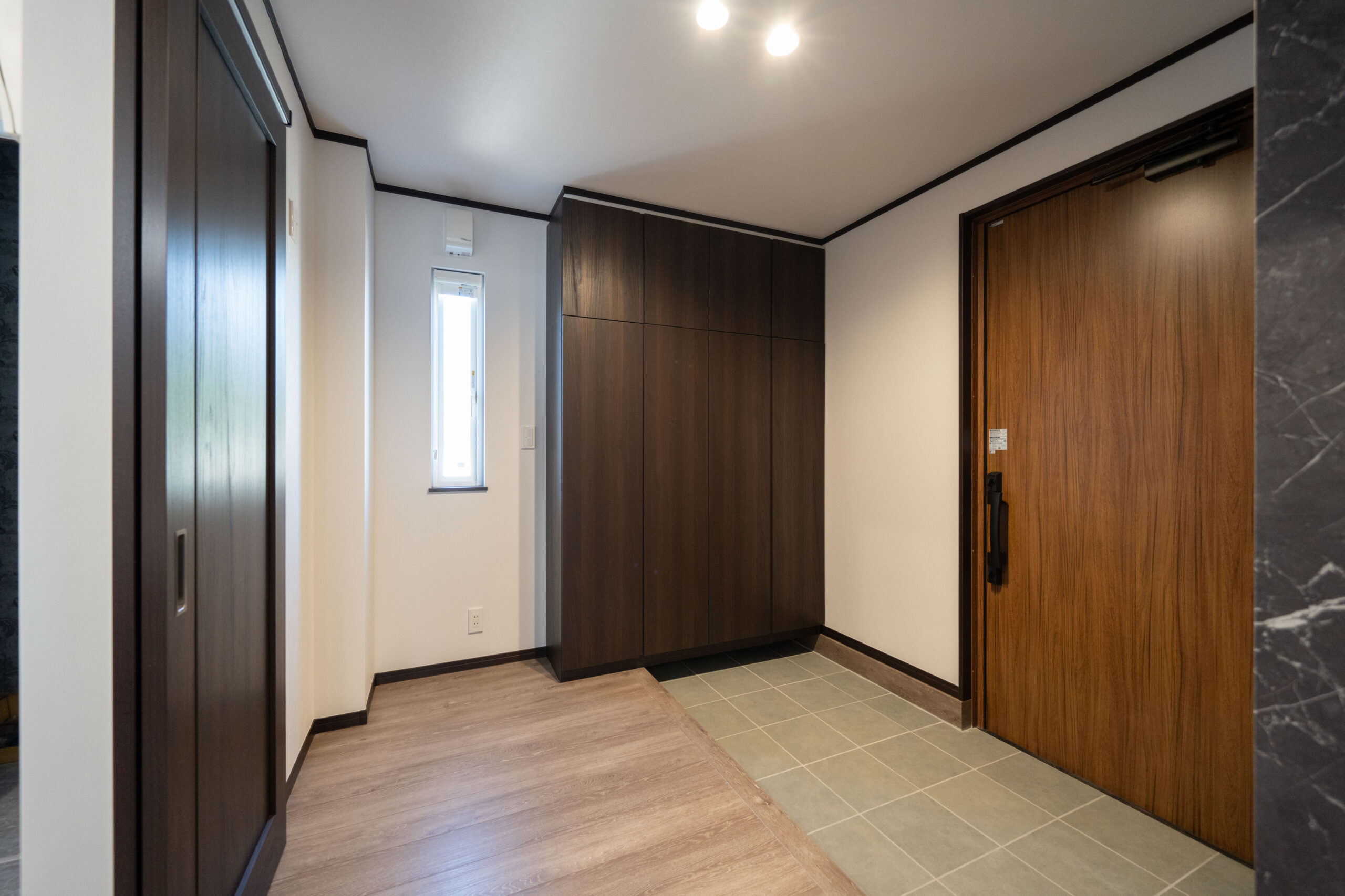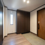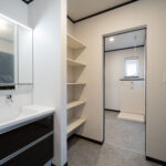 玄関から入ってすぐの位置に設けられた洗面スペースは、脱衣室とは独立したレイアウト。お客様も気兼ねなく使える動線設計で、手洗い習慣が自然と身に付きます。コンパクトながらも使い勝手の良さが光るスペースです。