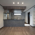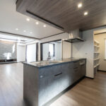ペニンシュラ型のキッチンは、折り下げ天井で空間に奥行きと立体感を演出。リビング・ダイニングと緩やかにつながりながらも、天井や照明の変化でキッチンエリアがしっかりと際立ちます。背面にはブラックの収納と家電スペースを備え、生活感を抑えたすっきりとした印象に。