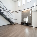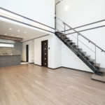 アイアンのリビング階段が印象的なLDKは、吹き抜けによる開放感と直線的なレイアウトが特徴です。空間全体を引き締めるダークトーンのラインや、壁掛けテレビスペースに施工されたエコカラットのアクセントが、シンプルモダンな雰囲気を際立たせています。