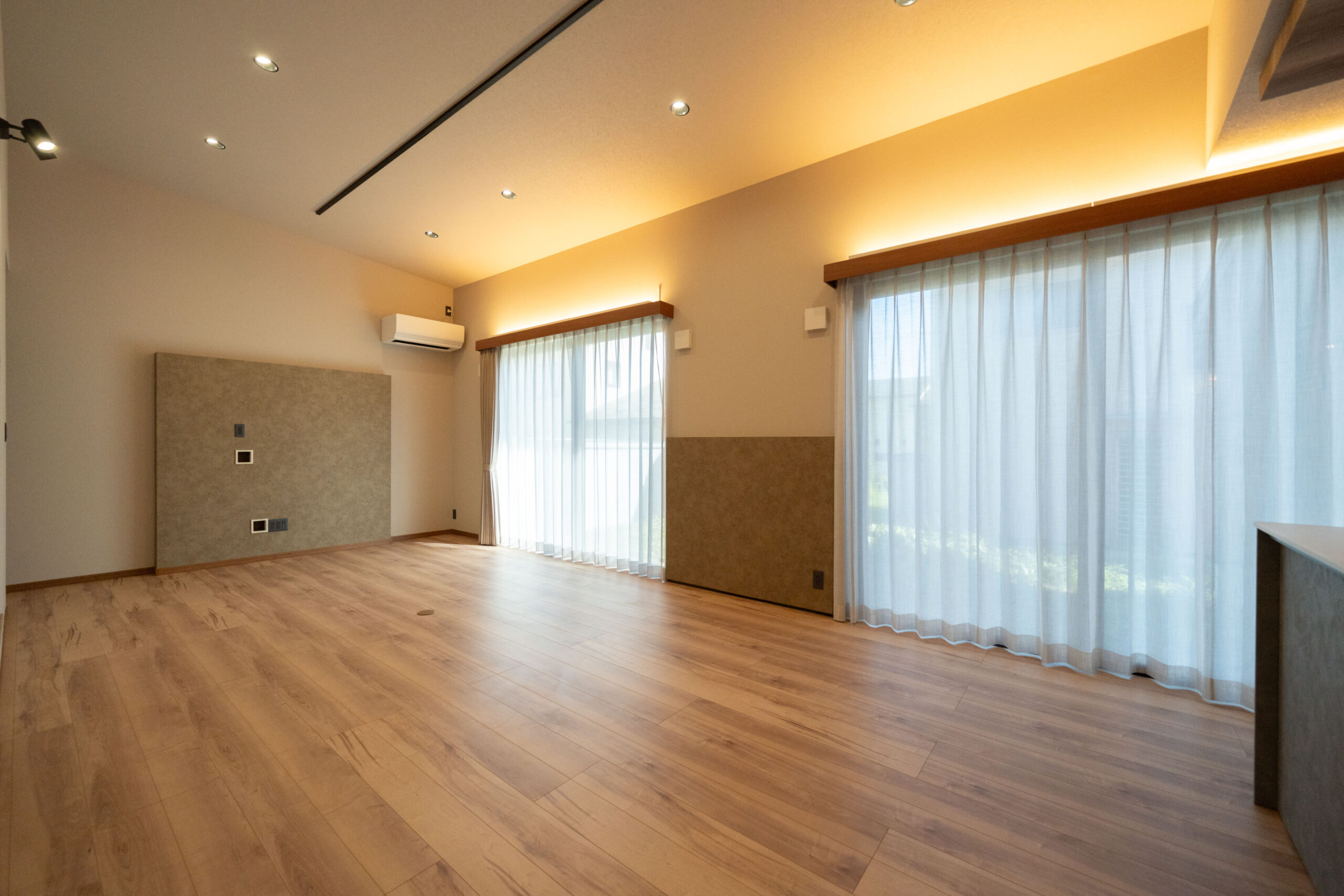 柔らかな木目と間接照明が心地よい、和モダンテイストのLDK。勾配天井が空間をより広く、のびやかに見せてくれます。カーテン上部に設けた間接照明が、夜には柔らかな光で室内を照らし、昼と夜で異なる雰囲気が楽しめる空間に。LDKが一直線に配置されているため、家族のつながりも自然と生まれる間取りです。