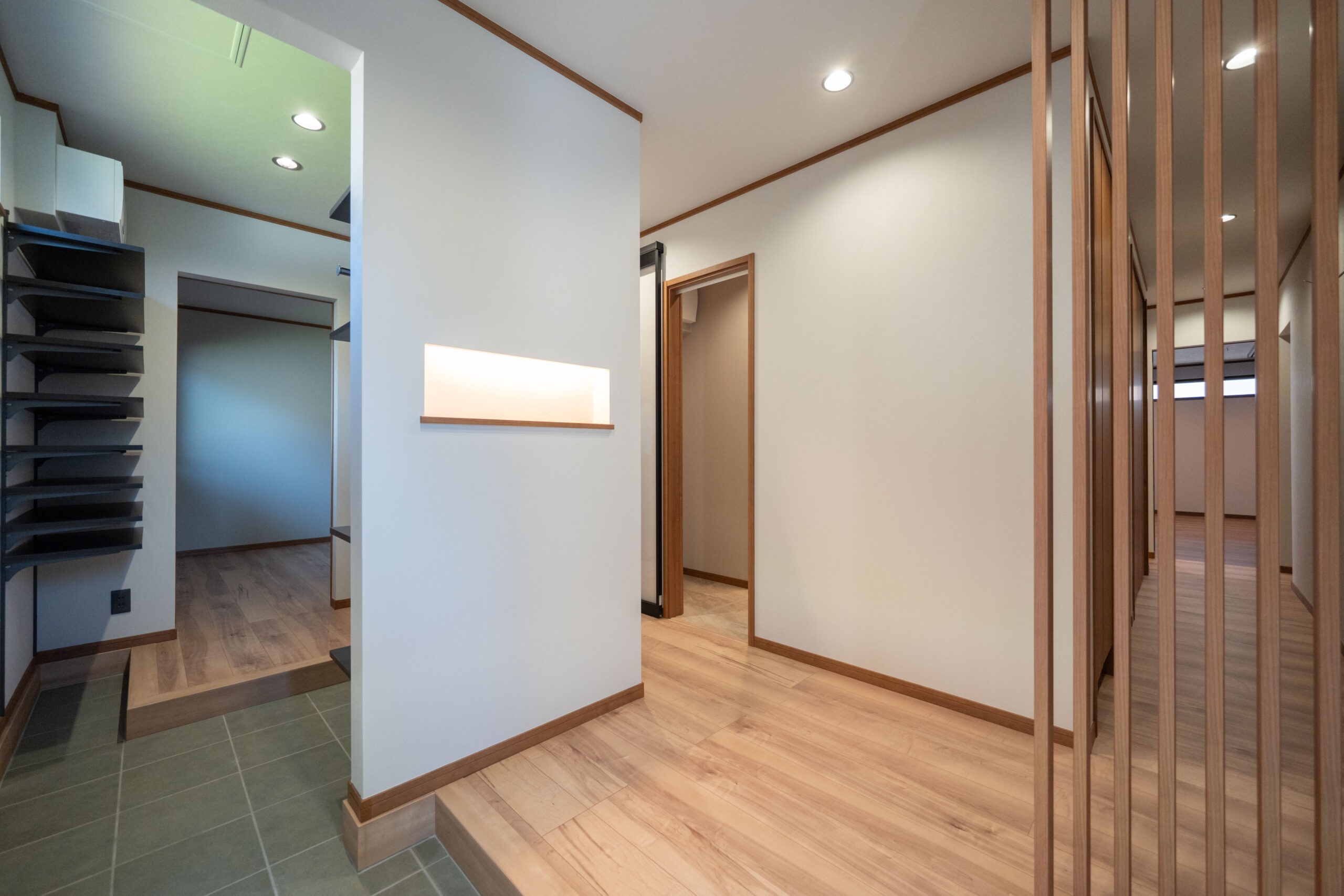 靴を脱ぐ場所と廊下を緩やかに仕切ったウォークスルー玄関。たっぷり収納できる土間収納と、玄関から直接洋室へアクセスできる動線が魅力。帰宅後の荷物の収納もスムーズで、暮らしやすさを高める工夫が随所に施されています。