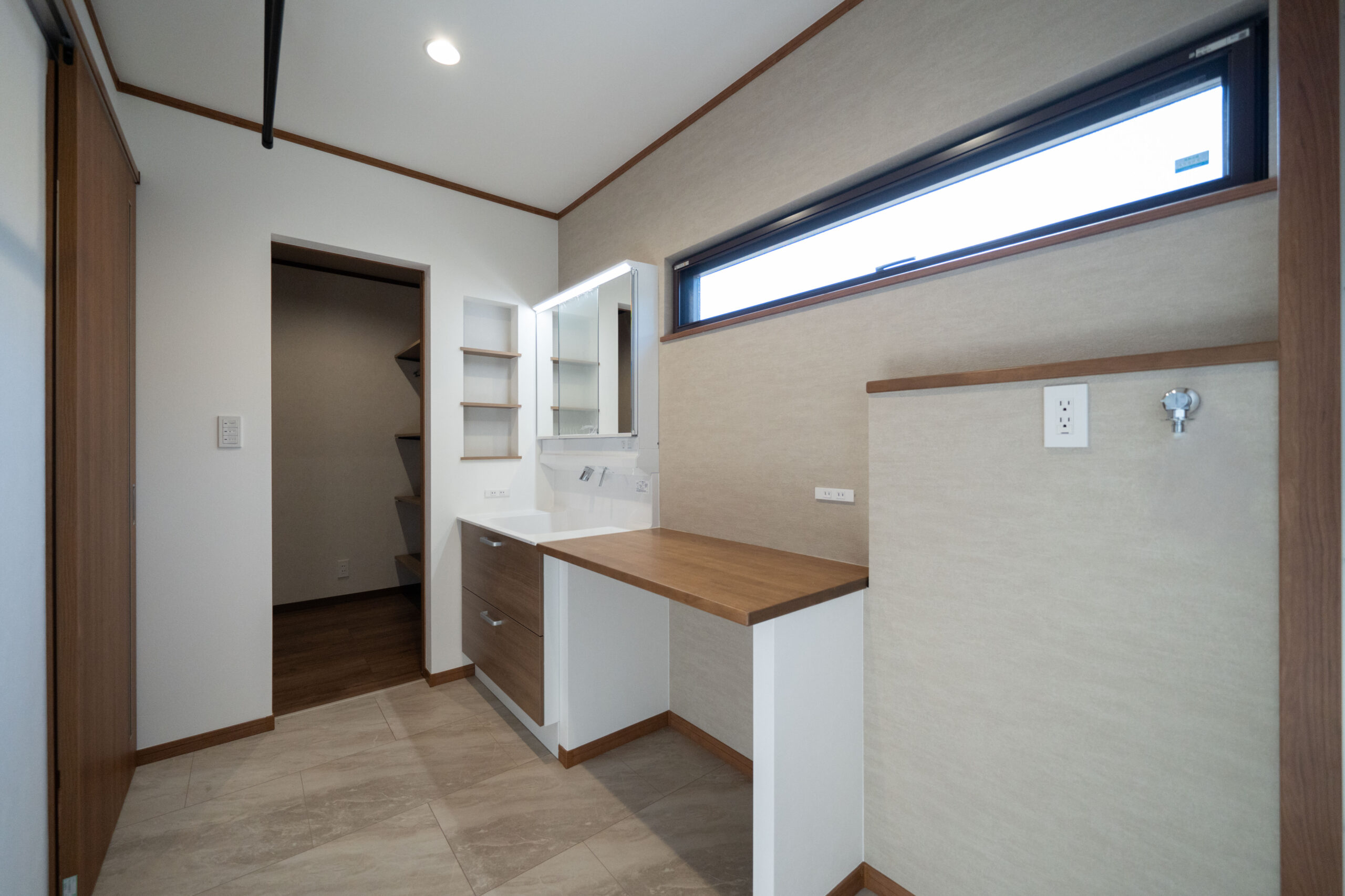 洗濯・室内干し・たたむ・収納まで、すべてが完結する効率的なランドリールーム。洗面台まわりにもカウンターや収納棚を設けており、アイロンがけやスキンケアなどの作業もストレスフリー。隣接するウォークインクローゼットへすぐに衣類を収納できる、家事ラク動線が整っています。