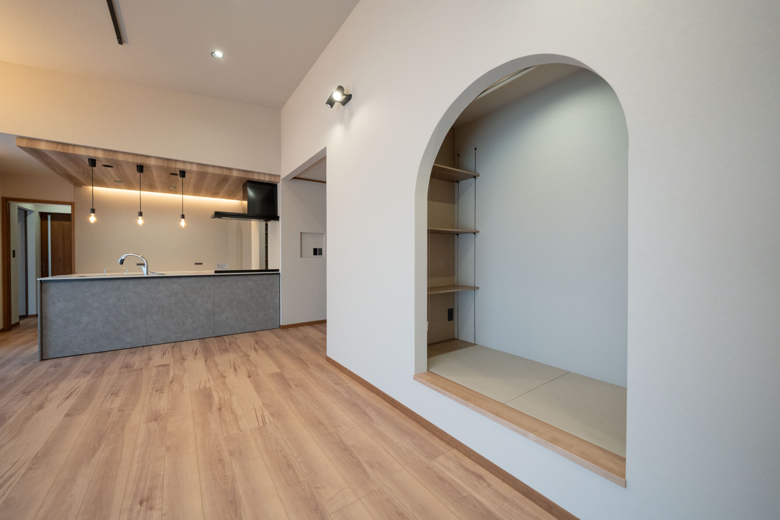 アーチ開口がかわいらしい、畳敷きのヌックスペース。ちょっと腰掛けて本を読んだり、リラックスした時間を過ごしたり。家族それぞれの “ちょうどいい居場所” として活躍してくれます。オープン棚付きでお気に入りの本や小物を飾るのにもぴったり。