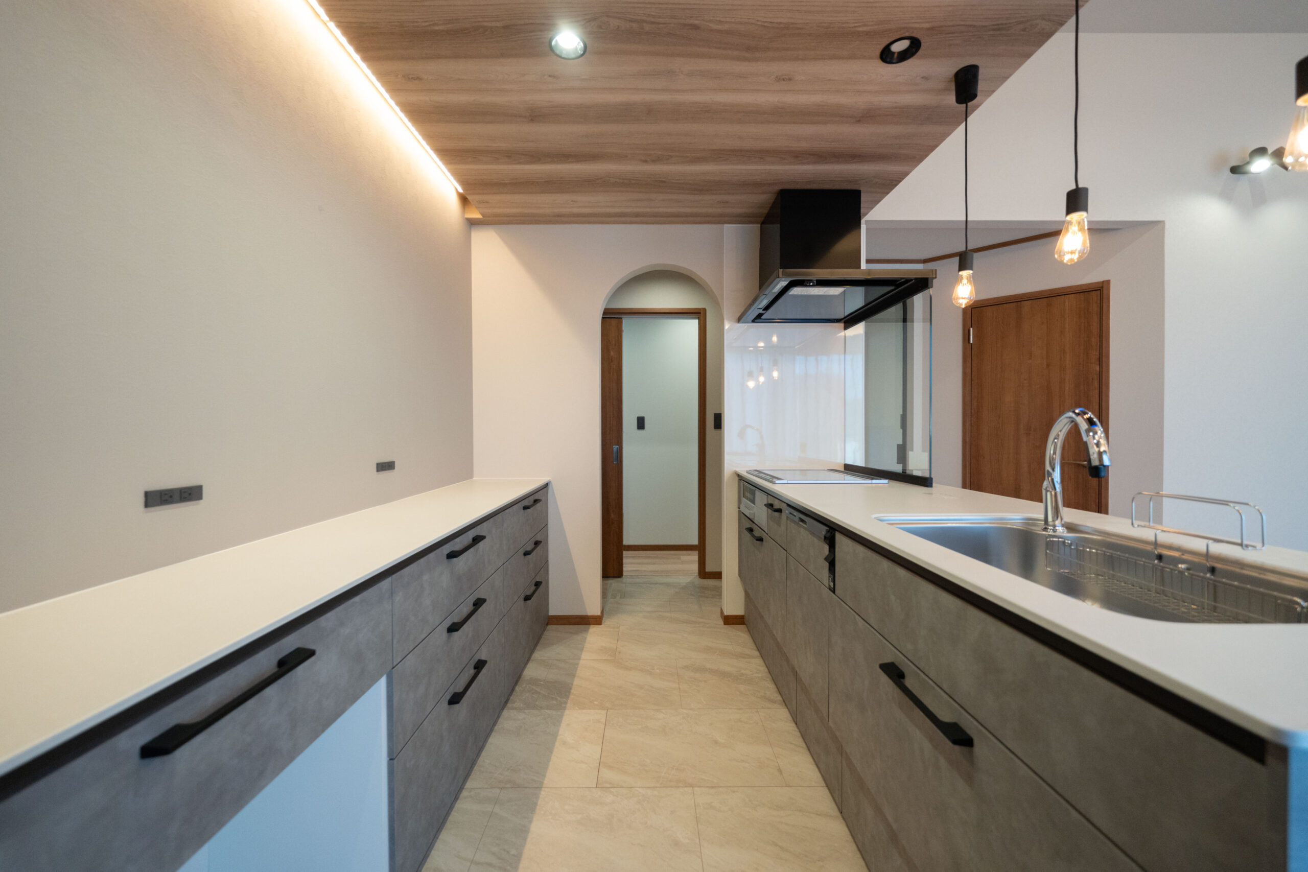 LDKと統一感のあるグレー系カラーでまとめたペニンシュラキッチン。キッチン上部には木目の下がり天井と間接照明を取り入れ、空間に奥行きとデザイン性をプラスしています。奥にはパントリーも設けているので、見た目すっきり&収納力も抜群。料理中の動線もスムーズで、使いやすさと美しさを兼ね備えたキッチンです。