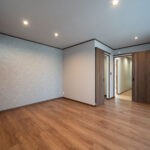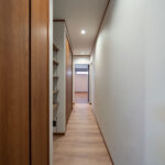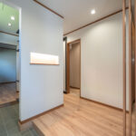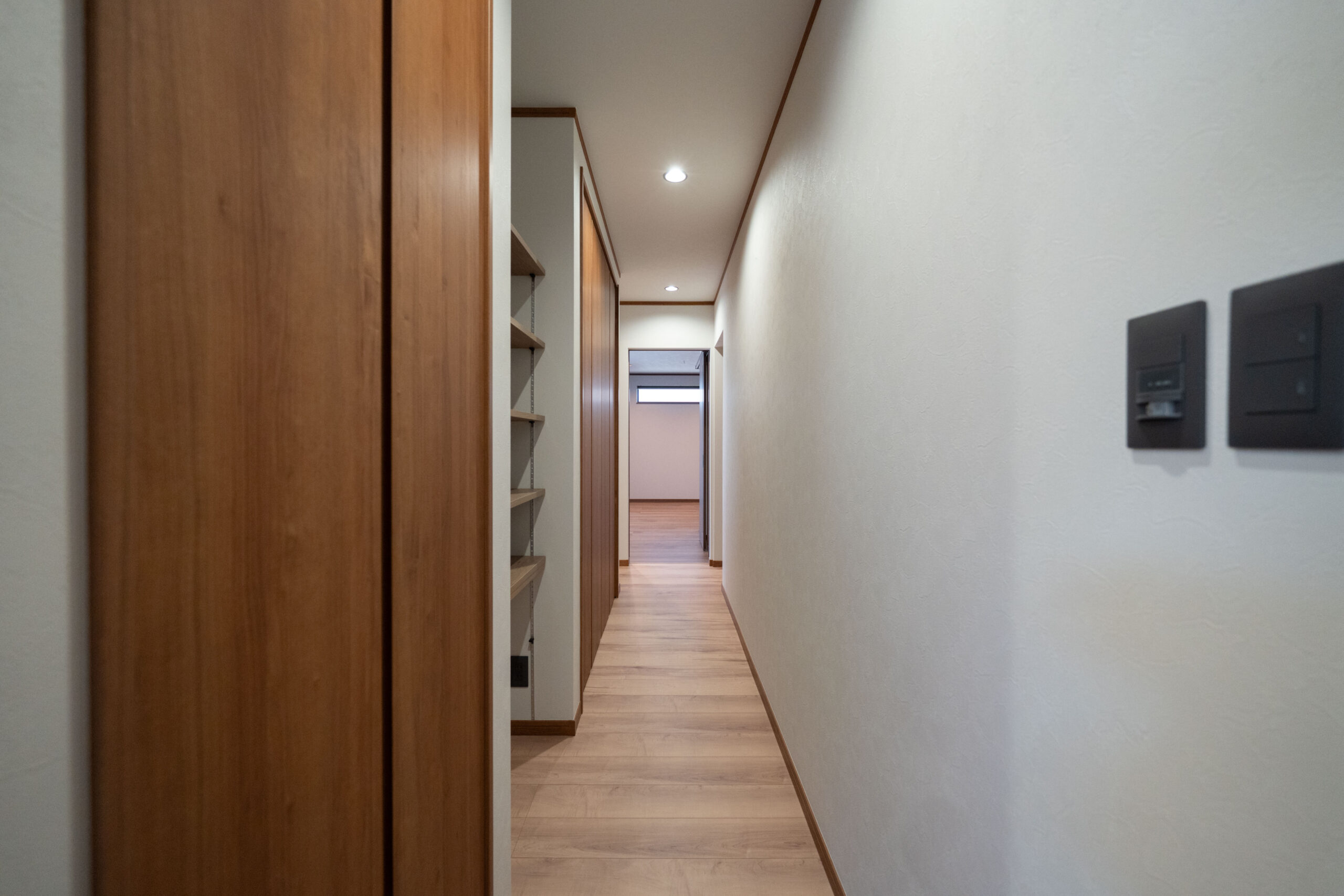 靴を脱ぐ場所と廊下を緩やかに仕切ったウォークスルー玄関。たっぷり収納できる土間収納と、玄関から直接洋室へアクセスできる動線が魅力。帰宅後の荷物の収納もスムーズで、暮らしやすさを高める工夫が随所に施されています。