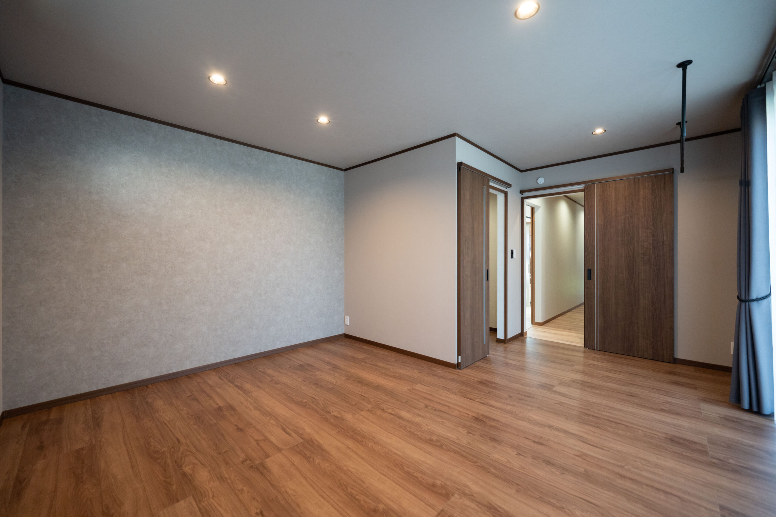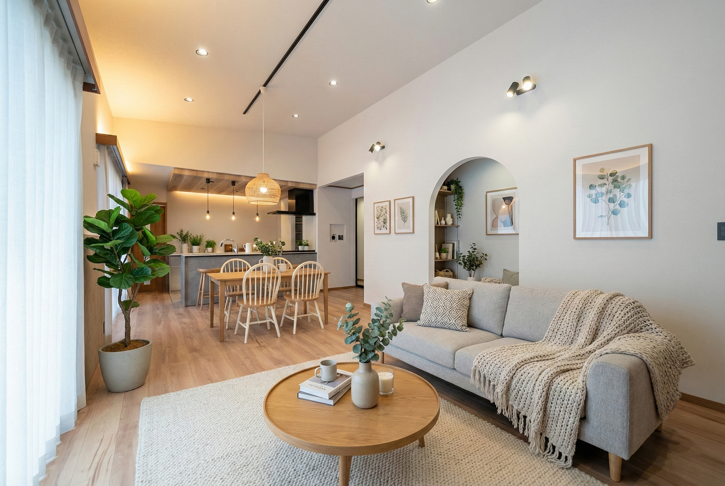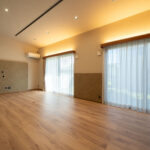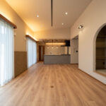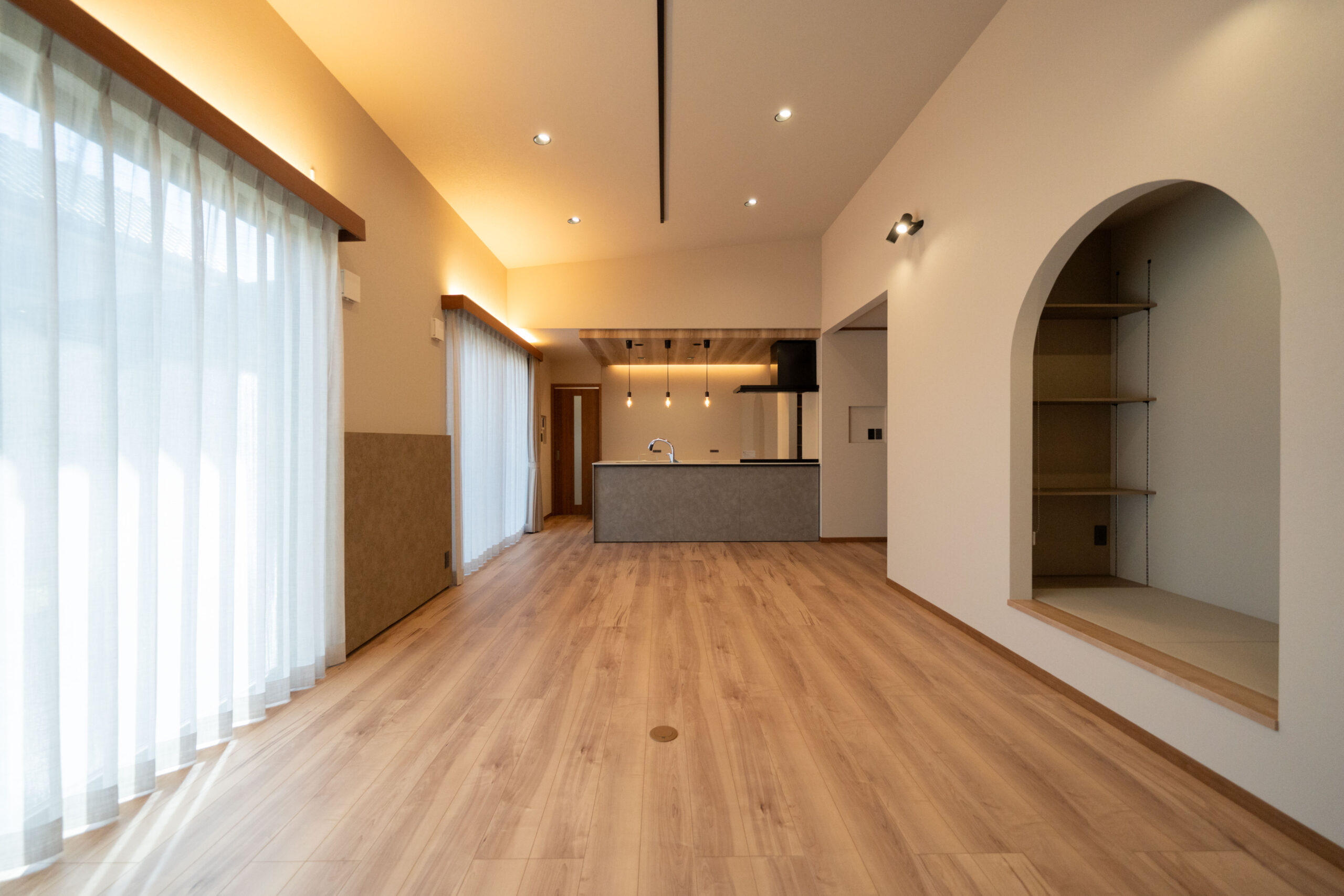 柔らかな木目と間接照明が心地よい、和モダンテイストのLDK。勾配天井が空間をより広く、のびやかに見せてくれます。カーテン上部に設けた間接照明が、夜には柔らかな光で室内を照らし、昼と夜で異なる雰囲気が楽しめる空間に。LDKが一直線に配置されているため、家族のつながりも自然と生まれる間取りです。