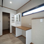 洗濯・室内干し・たたむ・収納まで、すべてが完結する効率的なランドリールーム。洗面台まわりにもカウンターや収納棚を設けており、アイロンがけやスキンケアなどの作業もストレスフリー。隣接するウォークインクローゼットへすぐに衣類を収納できる、家事ラク動線が整っています。