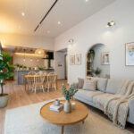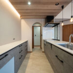 LDKと統一感のあるグレー系カラーでまとめたペニンシュラキッチン。キッチン上部には木目の下がり天井と間接照明を取り入れ、空間に奥行きとデザイン性をプラスしています。奥にはパントリーも設けているので、見た目すっきり&収納力も抜群。料理中の動線もスムーズで、使いやすさと美しさを兼ね備えたキッチンです。
