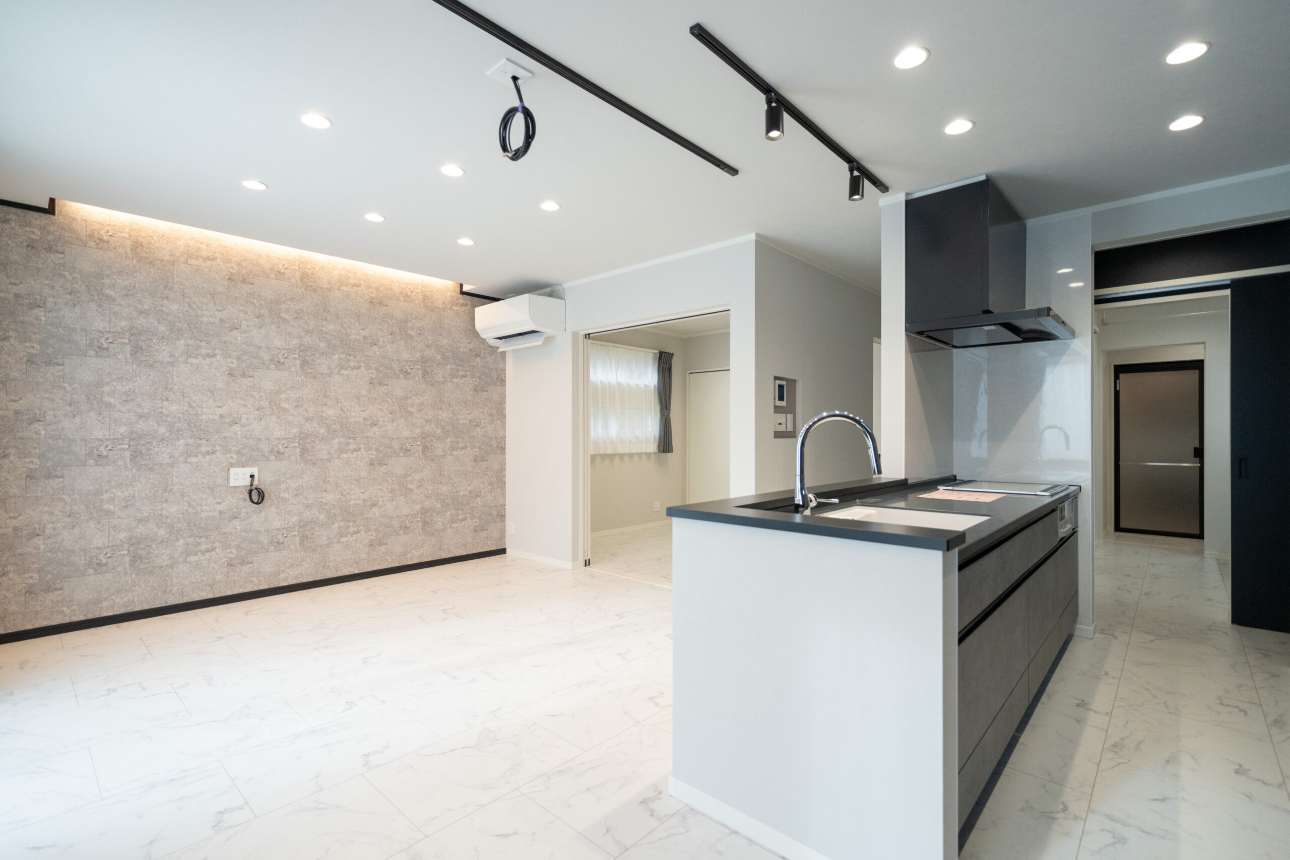 白を基調とした開放的なLDK。外観とのギャップを感じれる仕上がりになっています。