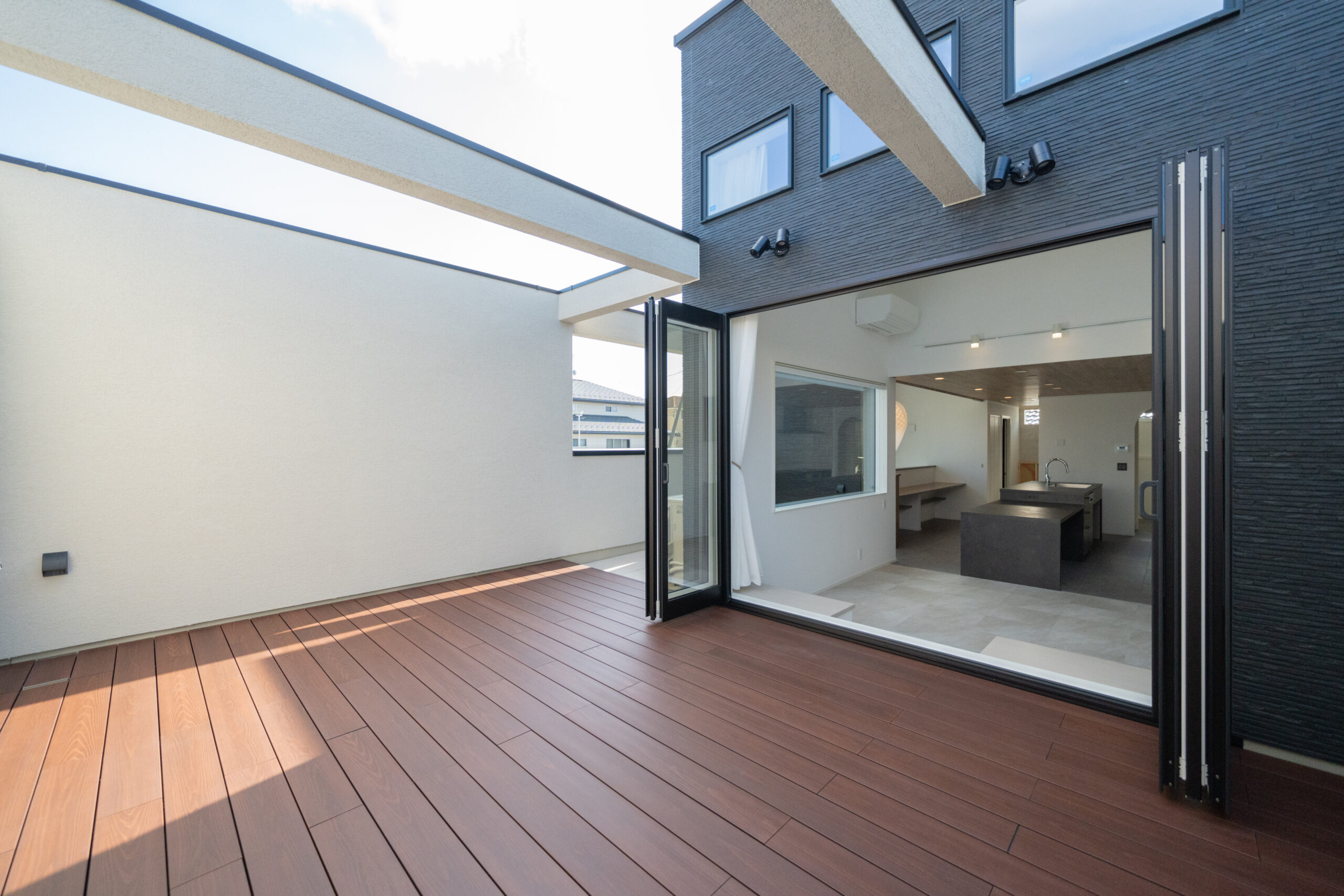 ネイビーをベースに木目調のアクセントを採用。キューブ型でモダンな外観に仕上がりました。また、玄関を外壁で隠すことで、視線も気になりません。