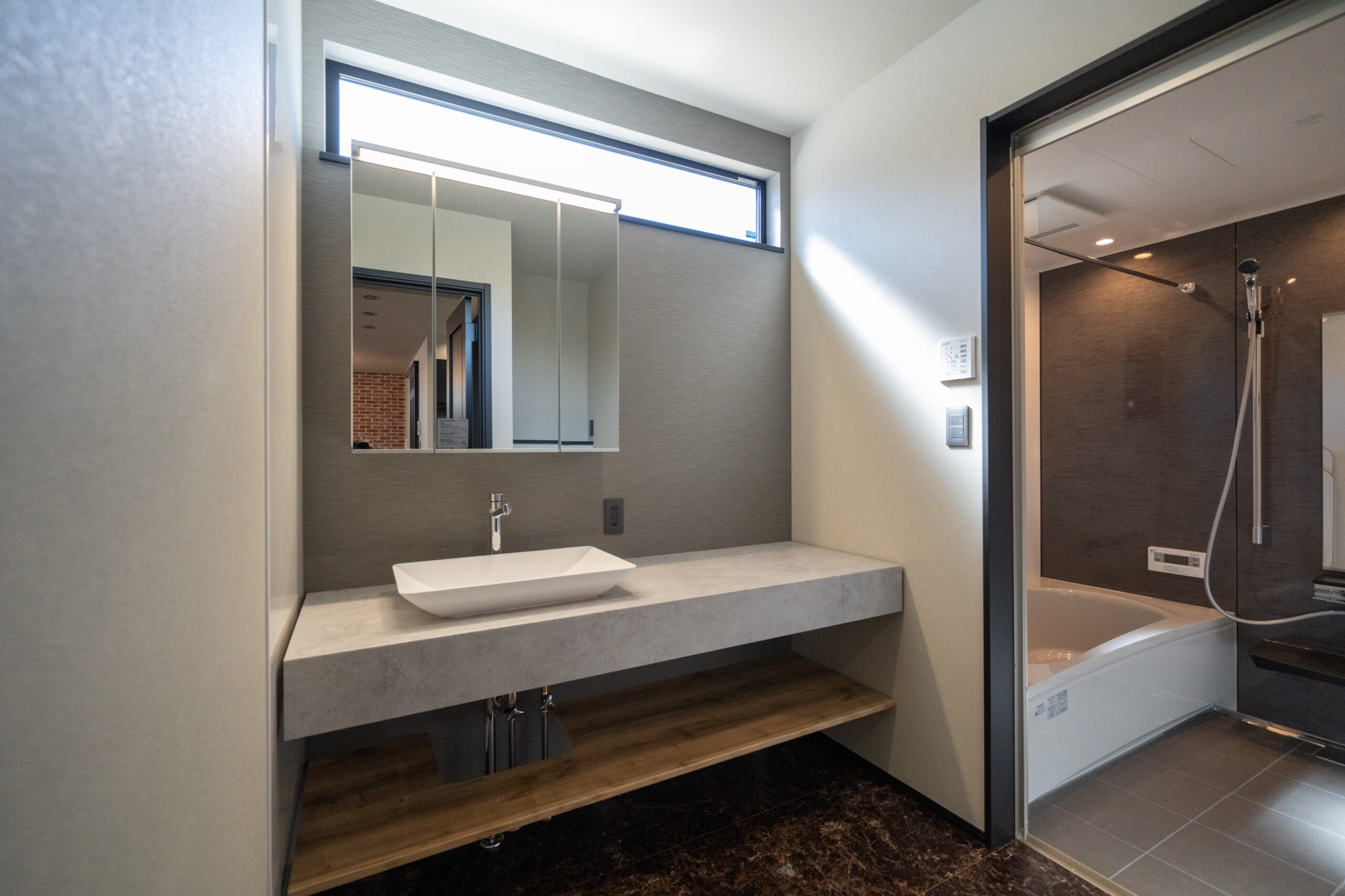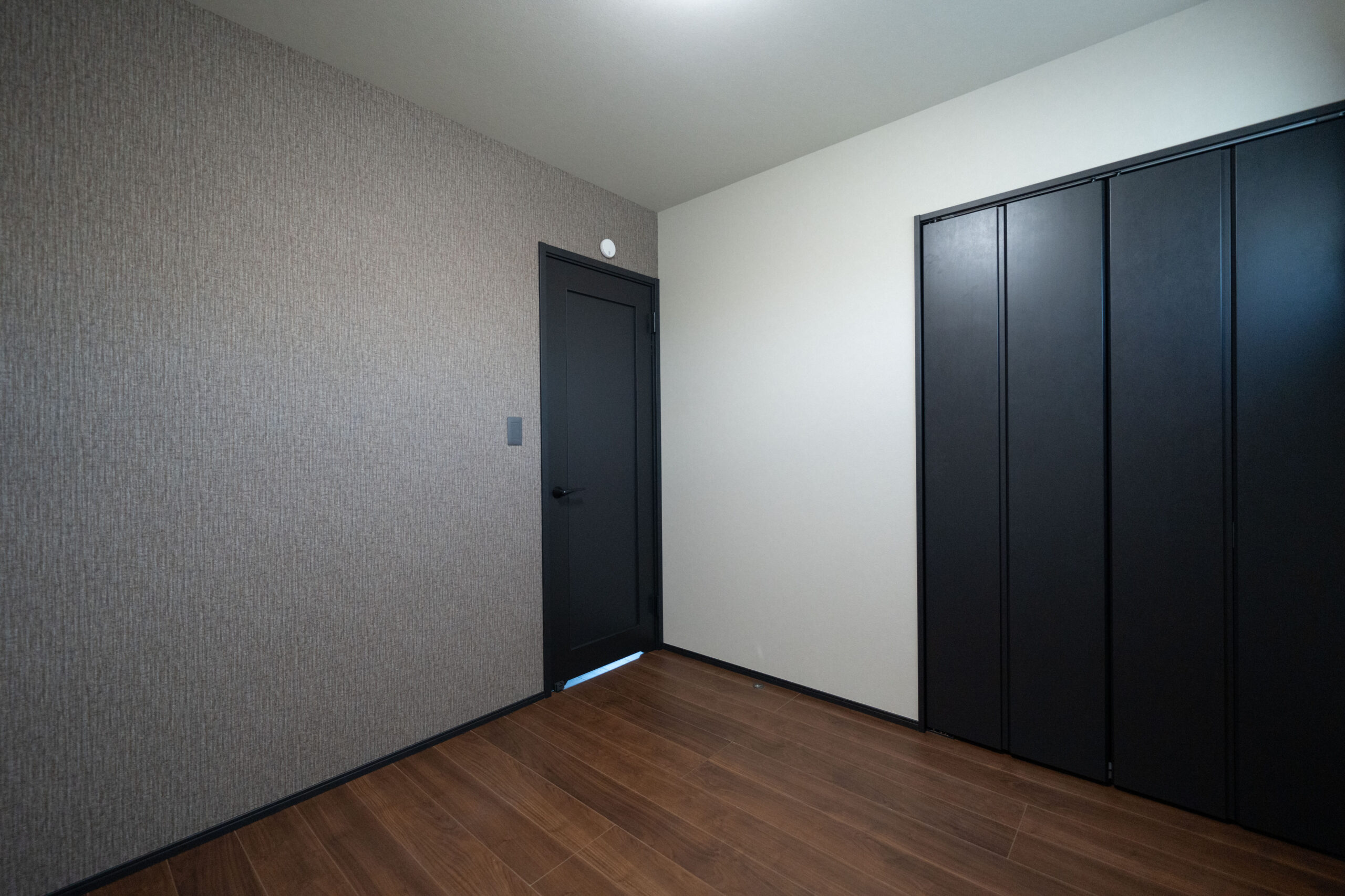 キッチンはブラックを基調に、空間を引き締めるクールなデザイン。背面には収納力たっぷりのパントリーを完備しており、生活感を抑えながら機能性も両立。玄関からリビングだけでなくキッチンにも直接アクセスできる動線設計で、買い物帰りもスムーズです。