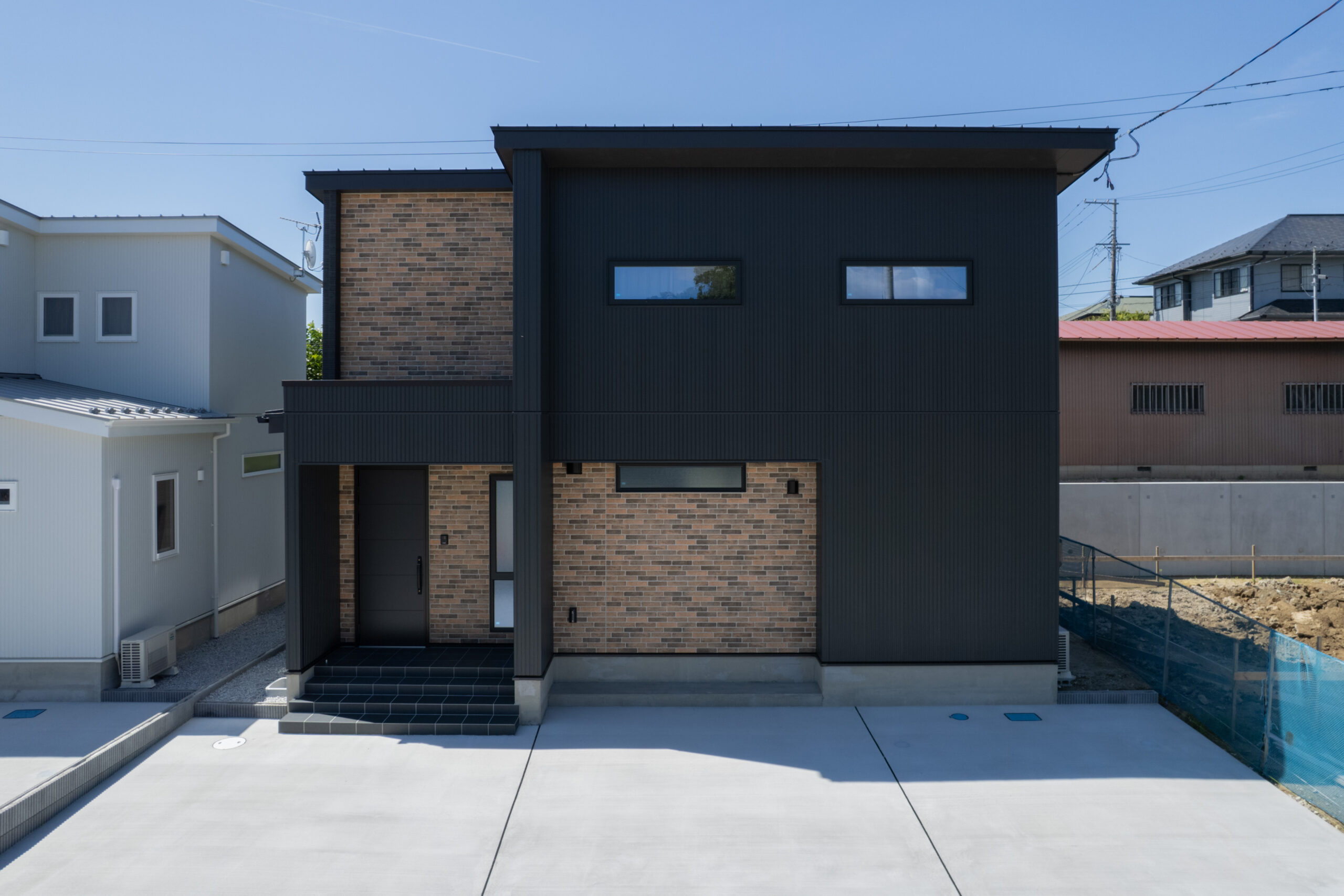 ブラックを基調としたスタイリッシュな外観に、レンガ調のアクセントが絶妙にマッチしたブルックリンスタイルの住まい。メインの外壁にはニチハの「リブ9」を採用し、金属のようなシャープな質感が個性を引き立てています。異素材を組み合わせることで、シンプルながらも印象的な外観に仕上がりました。