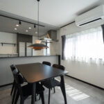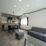 白とグレーをベースにしたスタイリッシュなLDK。フロアにはEIDAIの「コンカーボ」を採用し、モルタルのようなシンプルでも混ざりけのない素材感を素敵に表現。直線状の間口は広がりを感じさせ、家族がどこにいても続きを感じられる空間です。