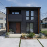 ブラックを質感よく主張した外観デザイン。正面部分にはグレイッシュな表情と細かな調度感を合わせ持つ「ケイミュー」のソリドを採用し、平面では表現できない素材感を演出。さらに両サイドにあしらわれた木目の袖壁が、無機質な黒の中にも、あたたかみを加える組み合わせになっています。
