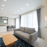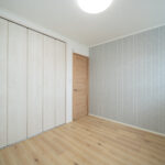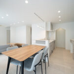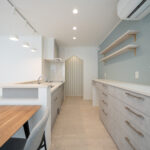 白を基調に、青みがかったウォールカラーのアクセントがかわいいLDKは、ノルディックスタイルのファンにもおすすめ。大きな窓によって光がたっぷり入り、明るく開放感あふれる空間に。キッチンとダイニングが縦一の配置なので、食事の配膳や片付けがすみやかにできる。