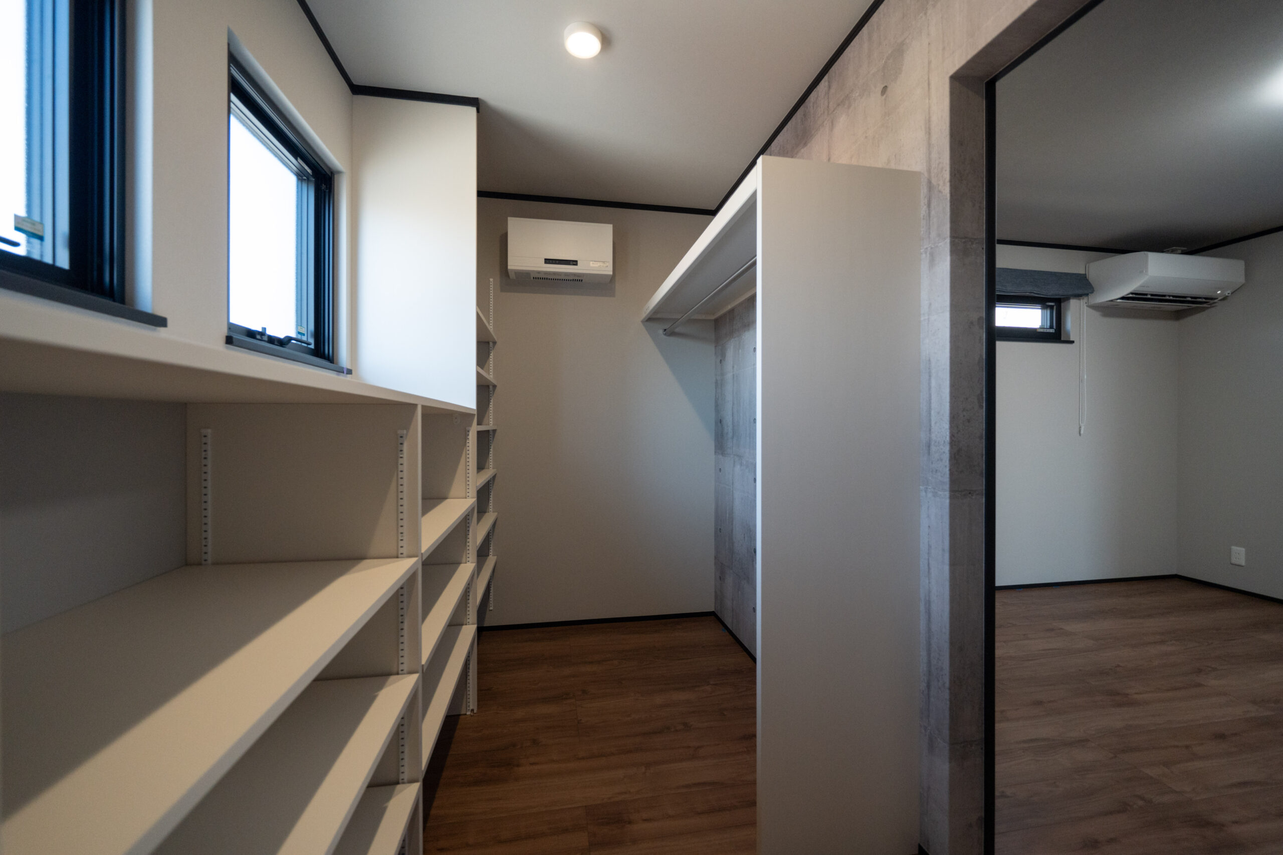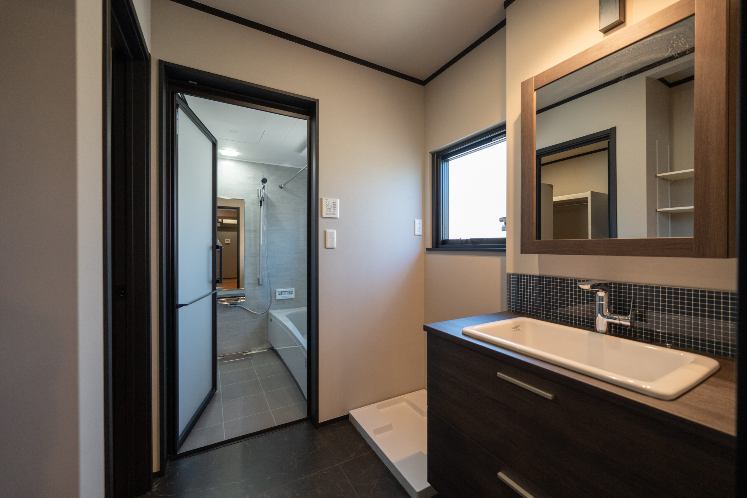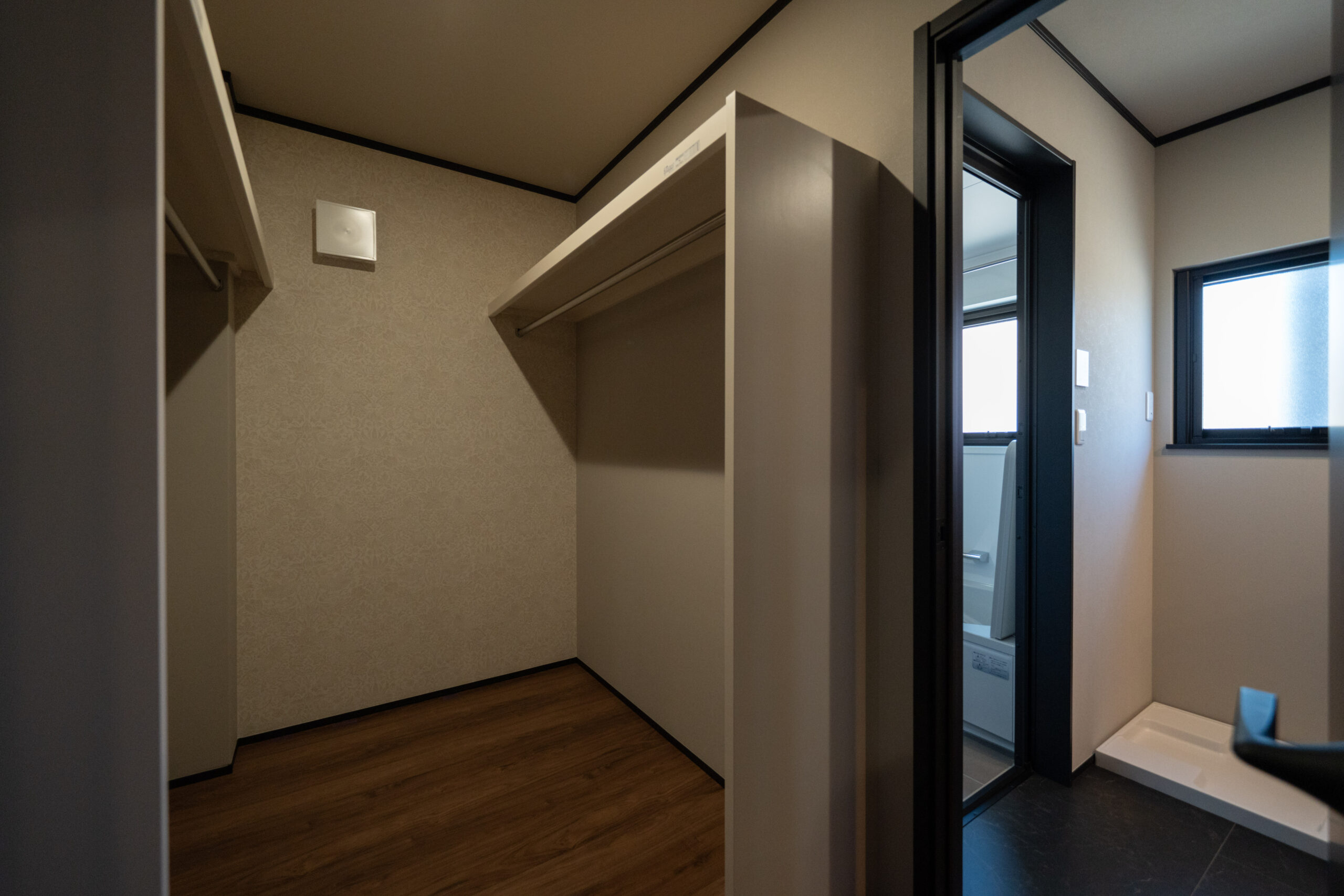 洗面スペースと隣接するファミリークローゼットは、朝の身支度や帰宅後の着替えがスムーズに完結できる便利な空間。リビング〜洗面〜クローゼットと回遊できる動線なので、どのタイミングでも使いやすいのが嬉しいポイントです。家族みんなの衣類がまとめて収納できるゆとりも魅力です。