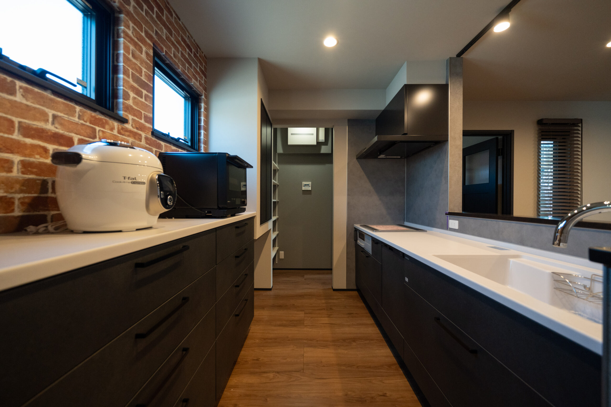 ブラックを基調にした外観は、レンガ調の外壁をアクセントに取り入れたブルックリンスタイル。直線的なフォルムがスタイリッシュで、無骨なかっこよさが漂います。重厚感のあるデザインながら、無駄を削ぎ落としたシンプルな構成が洗練された印象を与えます。