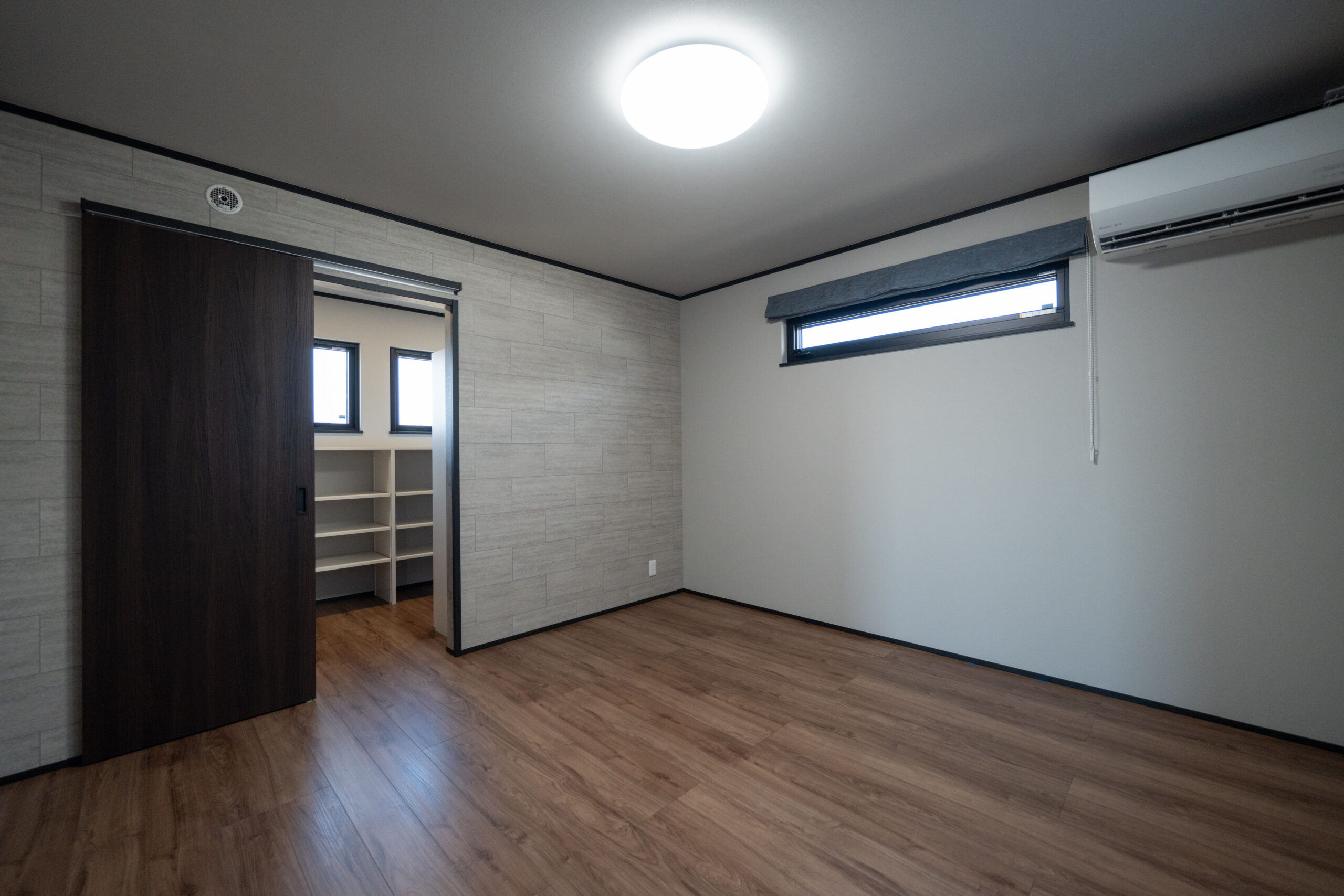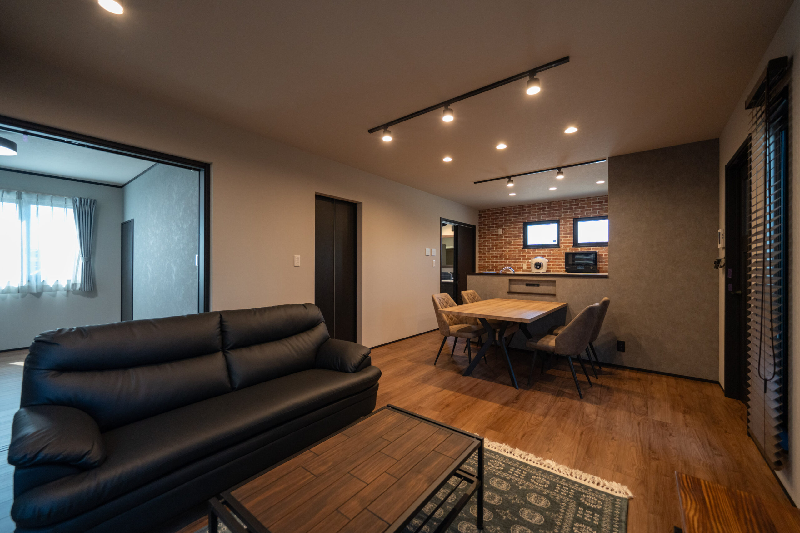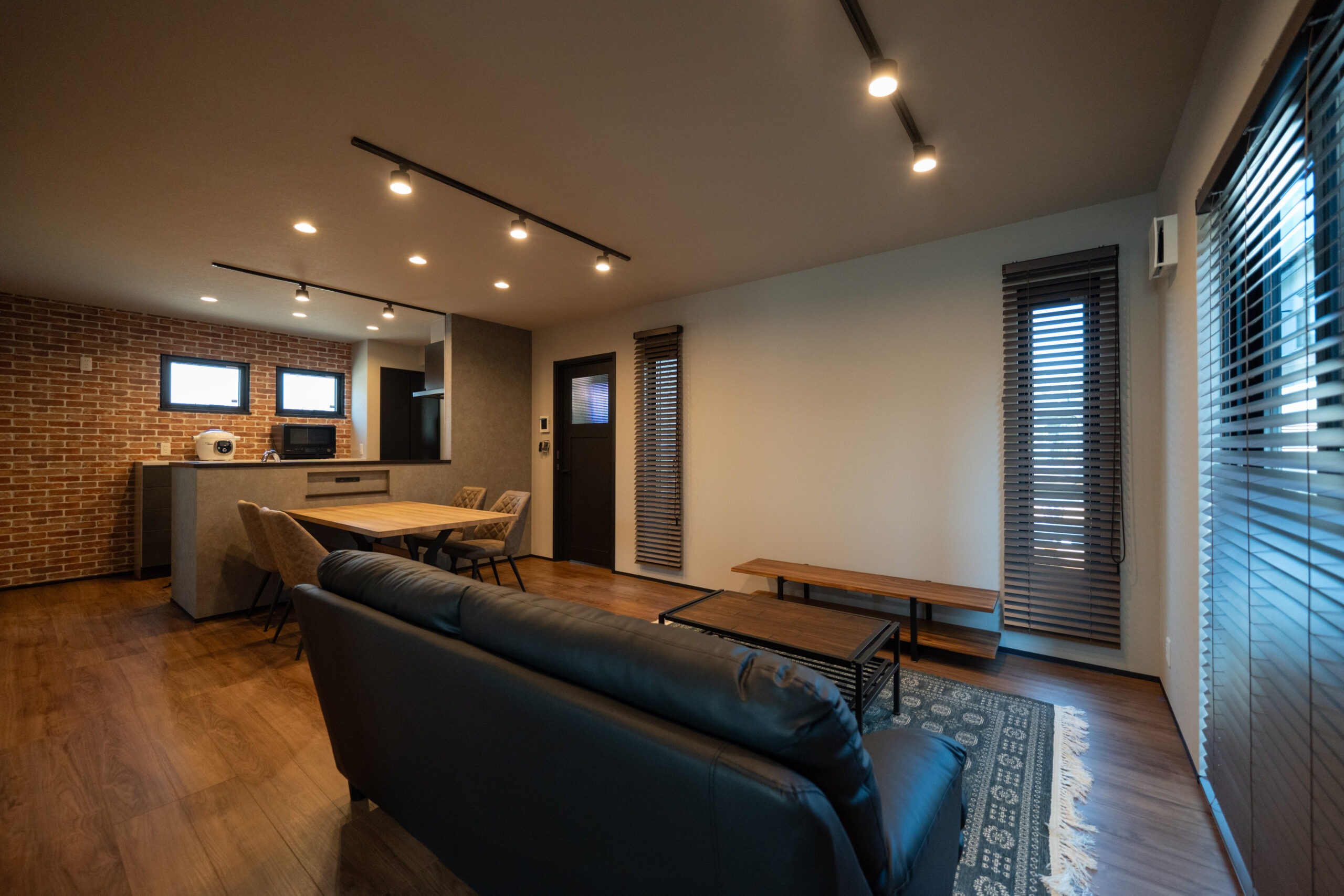 室内も外観の雰囲気をそのまま引き継いだ、ダークトーンでまとめられた空間。グレーをベースに、レンガ調クロスやウッドブラインドがアクセントになり、武骨でかっこいい雰囲気に仕上がっています。落ち着いた空間なので、家具や照明で個性をプラスしながらも統一感のあるコーディネートが可能です。