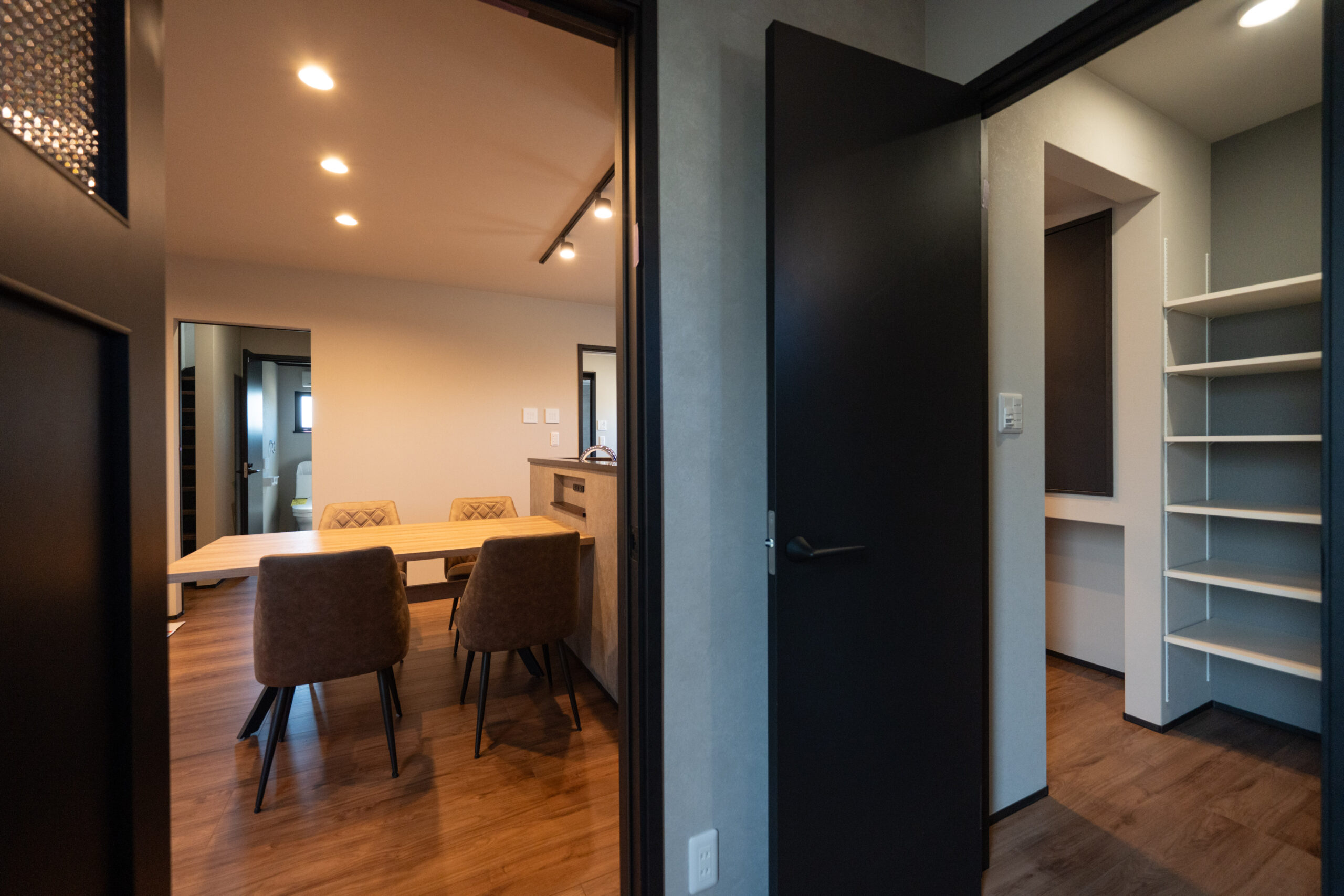 玄関からリビングへはもちろん、もうひとつの動線としてパントリーを通ってキッチンへ向かうルートも確保。買い物帰りにすぐ荷物をしまえる便利な設計です。生活感を見せずに済むスマートな動線設計が、日々の暮らしを快適にサポートします。