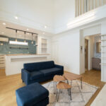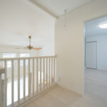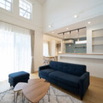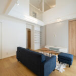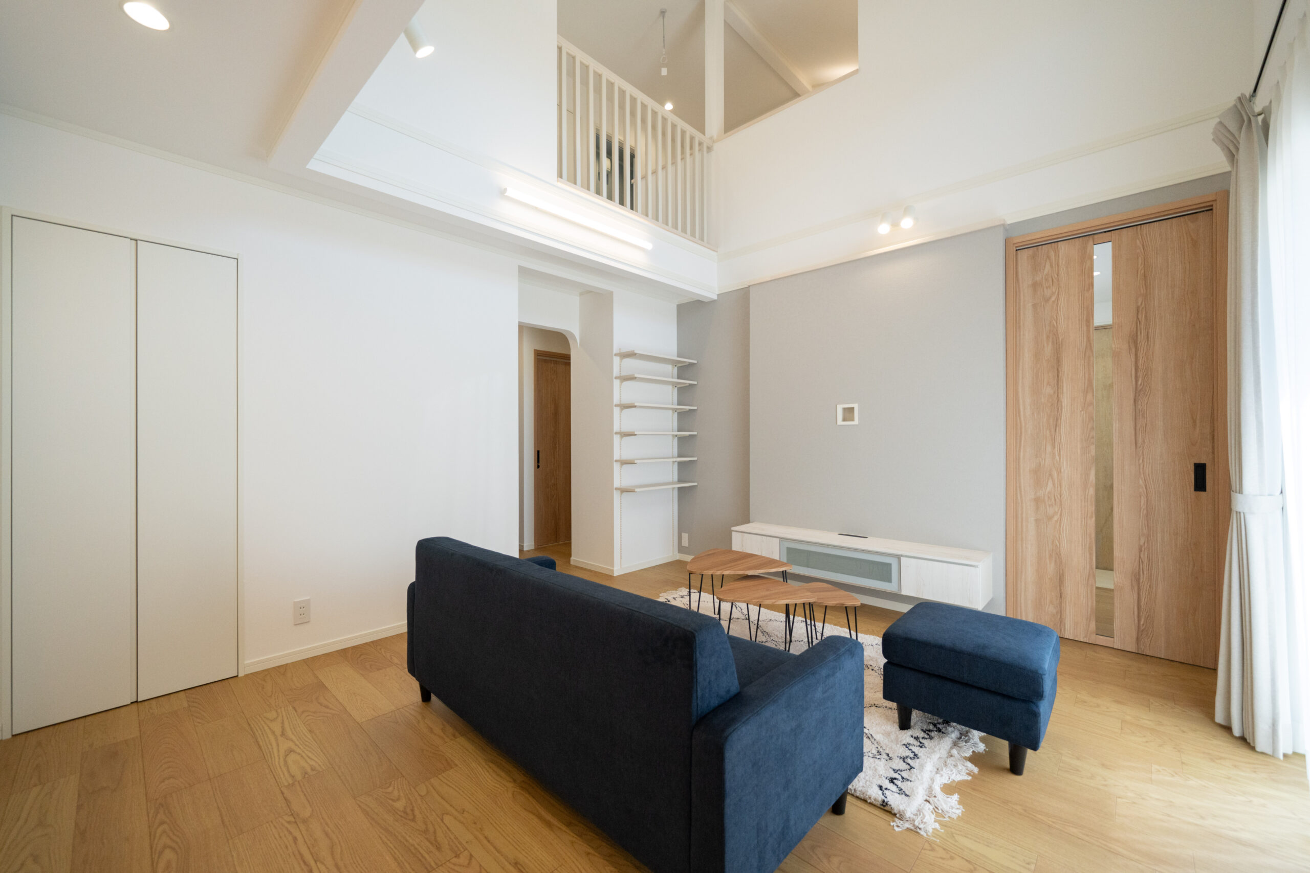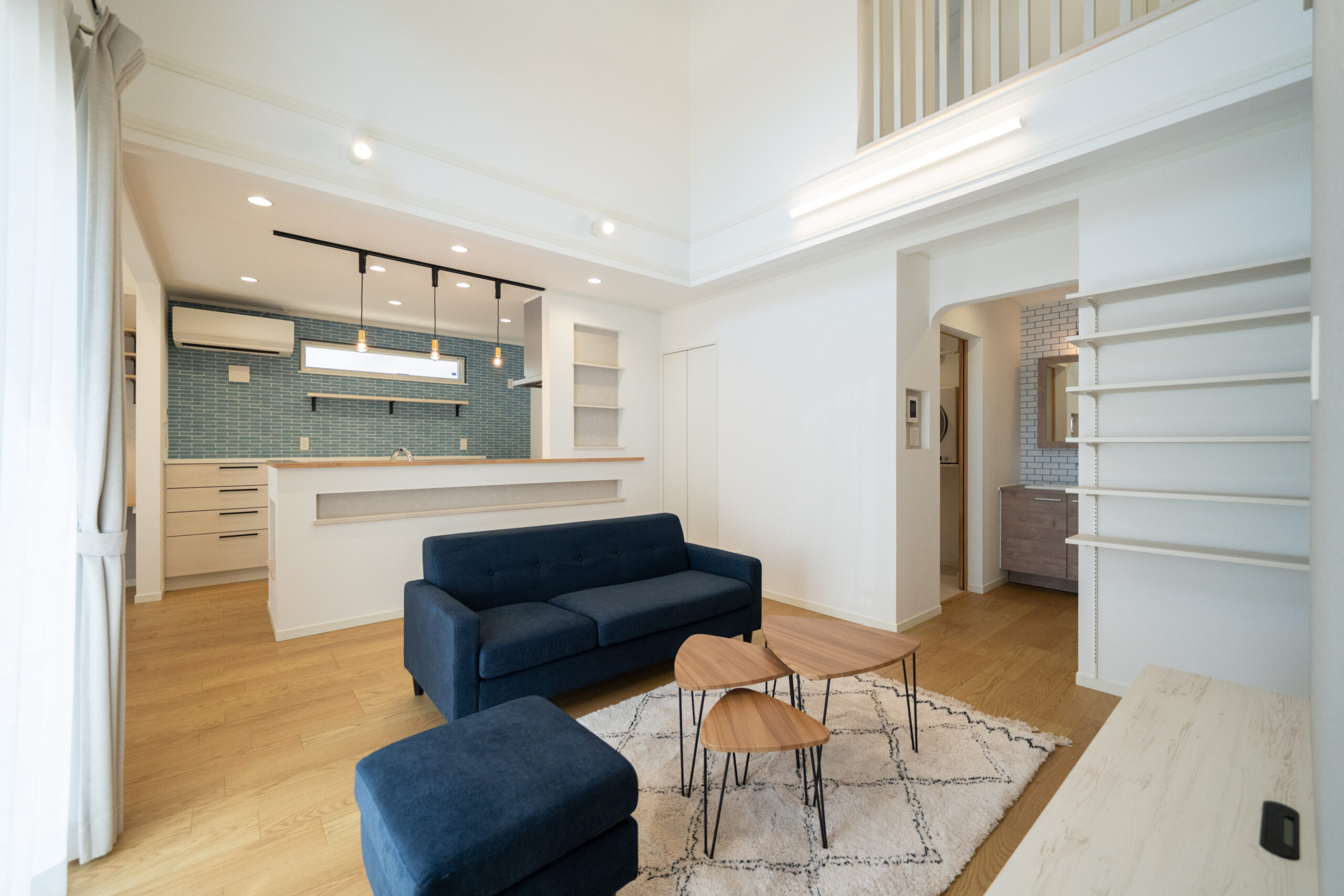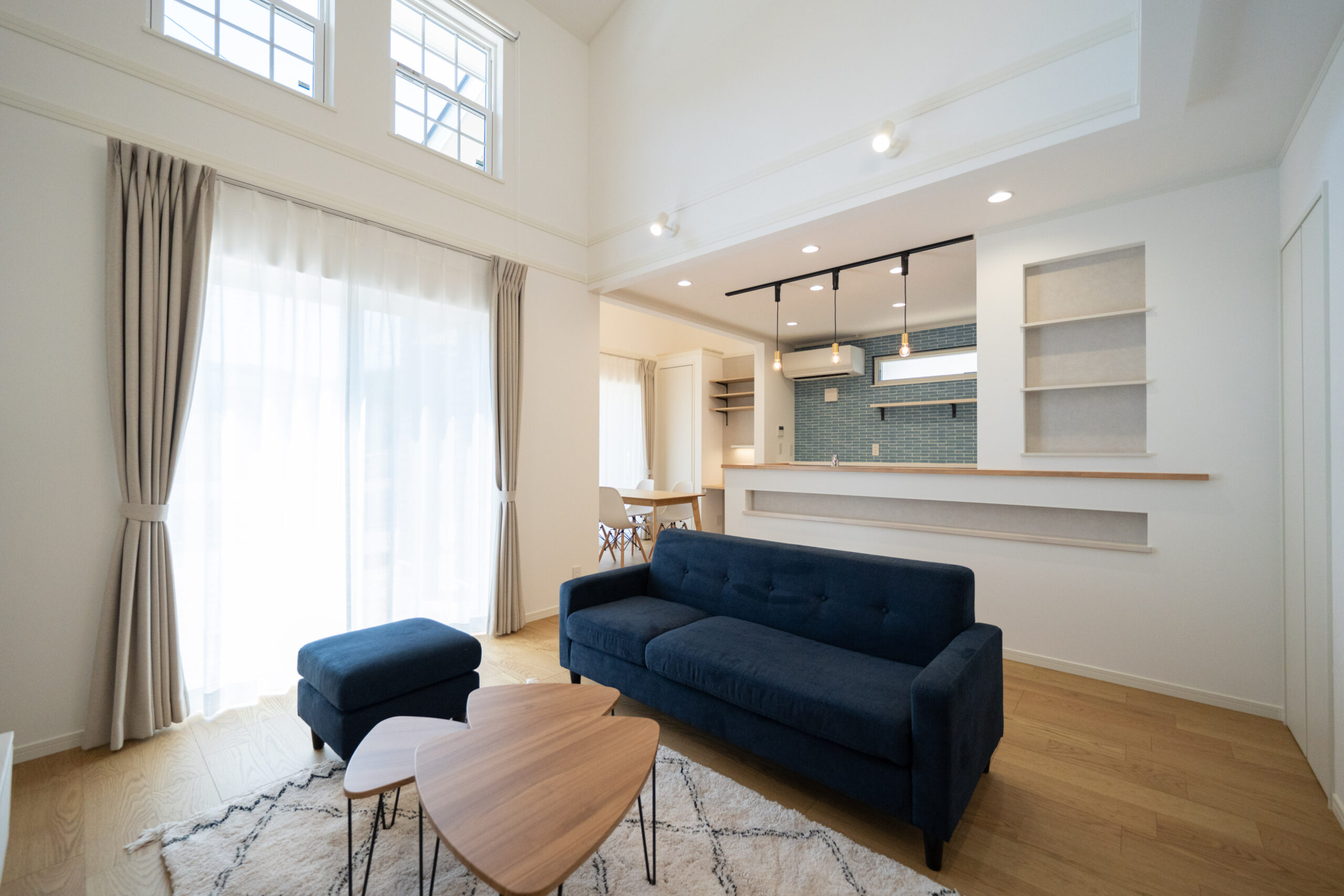 吹き抜けから光がやさしく降り注ぐ、開放感たっぷりのリビング。大きな窓から入る自然光と、白を基調とした内装の組み合わせで、実際の広さ以上に明るく広々と感じられます。さらに2階のホールからリビングを見下ろせるため、家族の気配を自然に感じ取れるのも心地よいポイント。