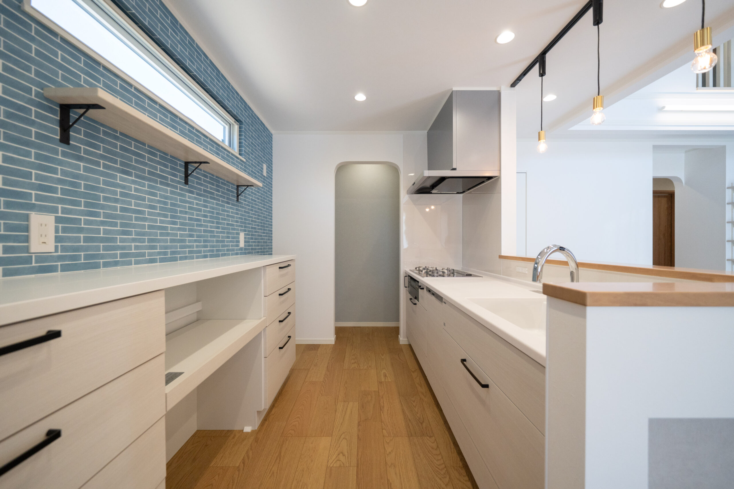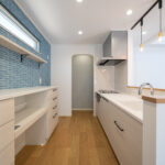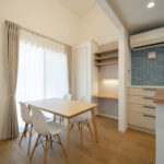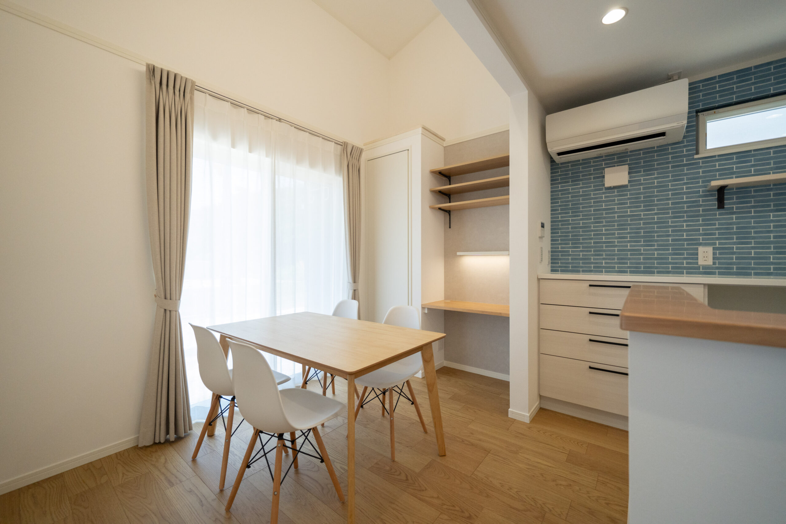 キッチンとダイニングを横並びにしたレイアウトは、家事の動線が短くなることで、毎日の「ちょっと面倒」が自然と減っていきます。奥にはパントリーもあり、食品やキッチン用品をすっきり収納できる実用性も魅力です。ダイニング横にはカウンターを設けており、ちょっとした作業やお子さんの宿題スペースとしても大活躍。