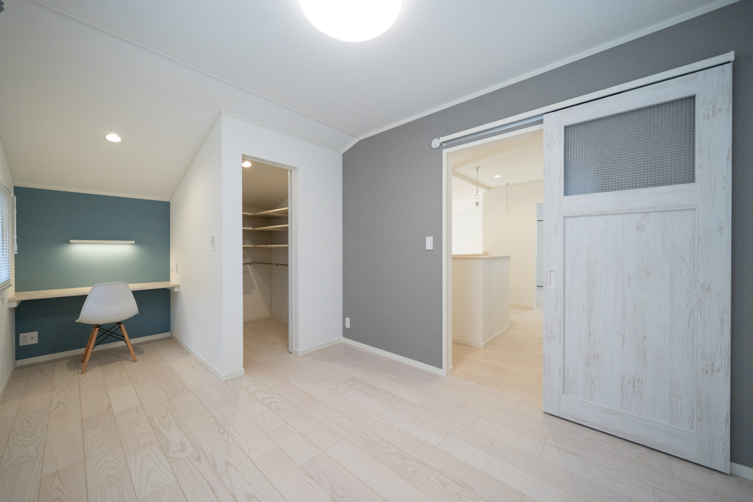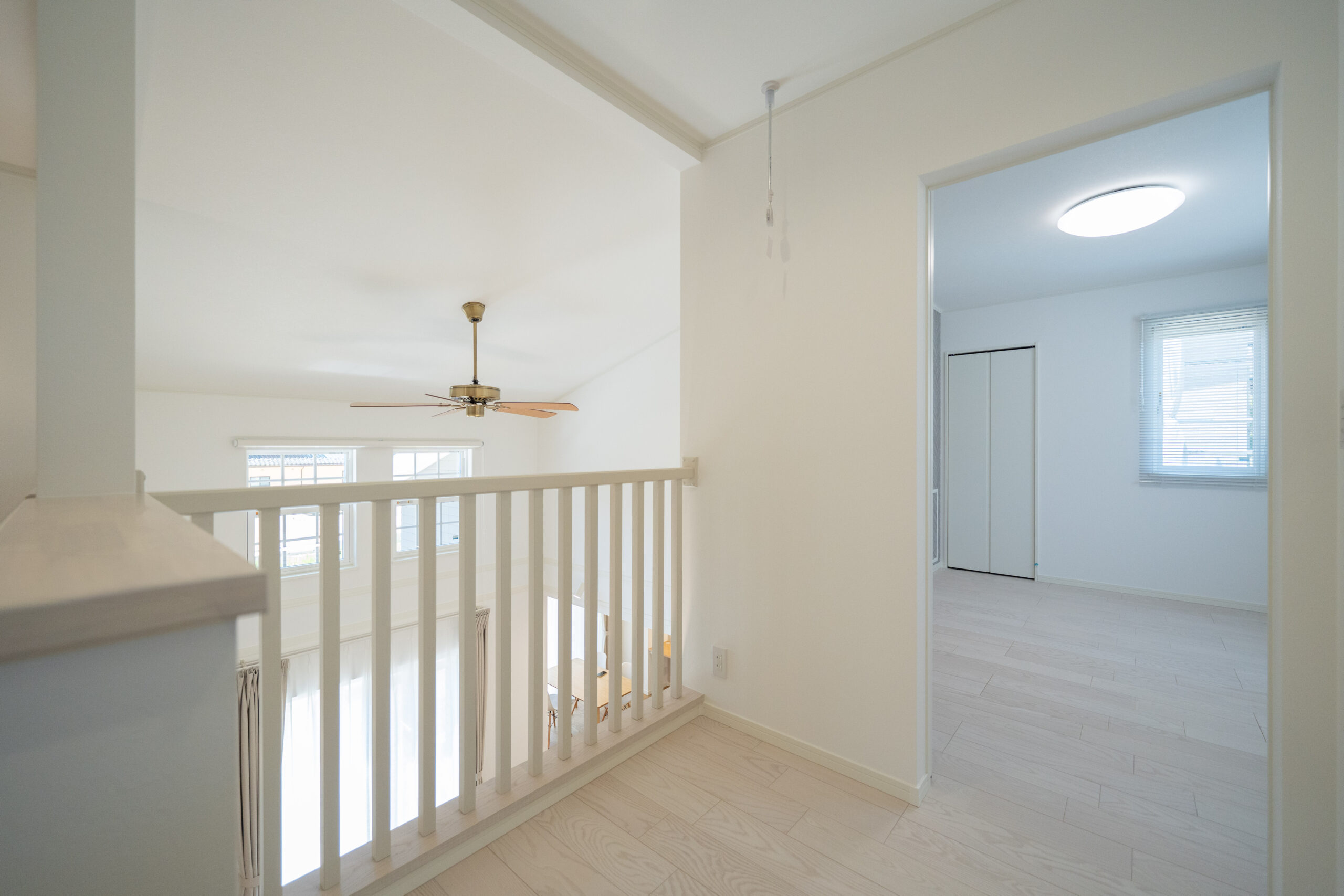 吹き抜けを見下ろす2階ホールには、室内物干しスペースを完備。天気を気にせず洗濯物が干せるだけでなく、リビングにつながる開放的な視線のおかげで家中の一体感が感じられます。洋室にはカウンターやウォークインクローゼットがあり、暮らしに合わせて柔軟にアレンジできるのも嬉しいポイント。
