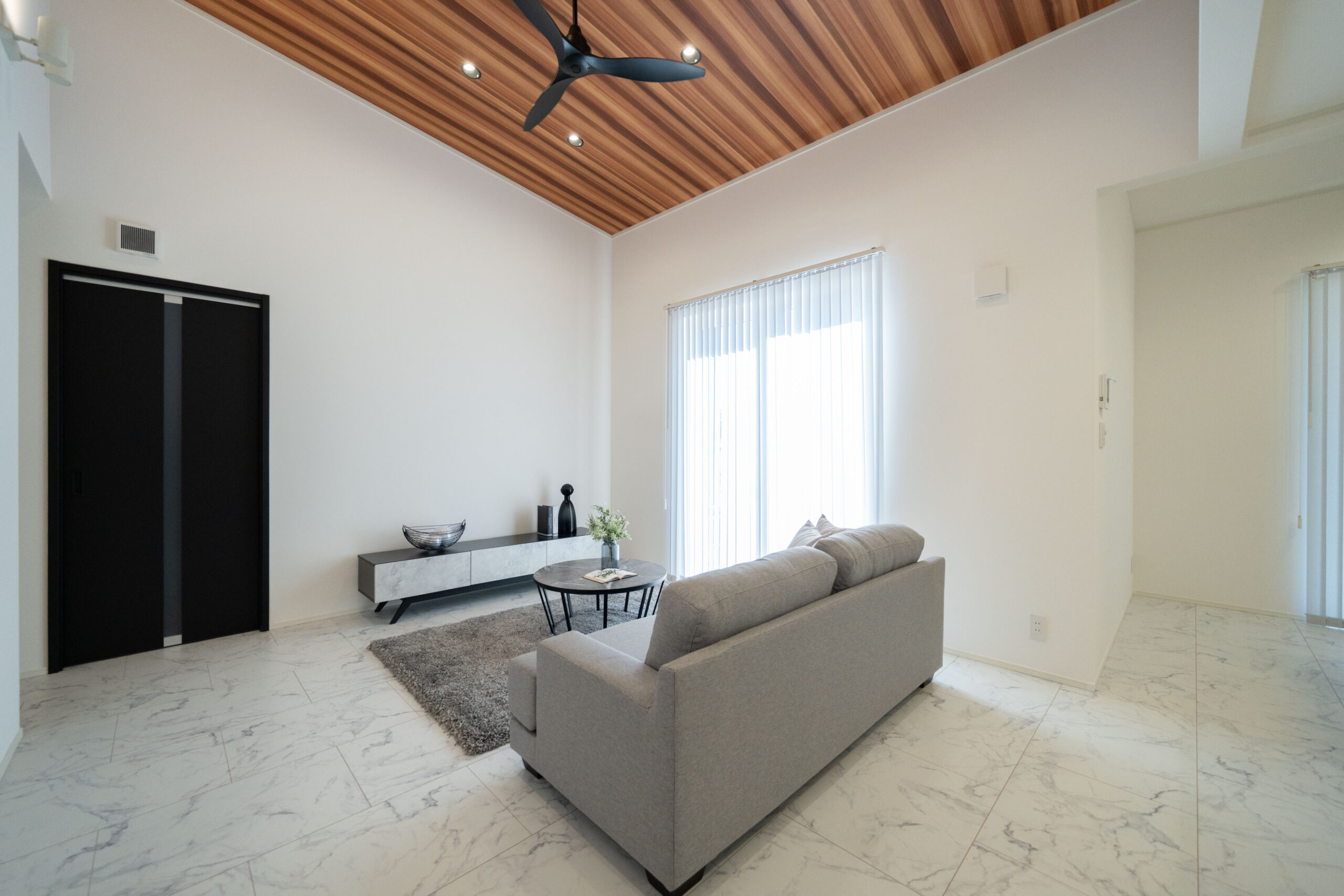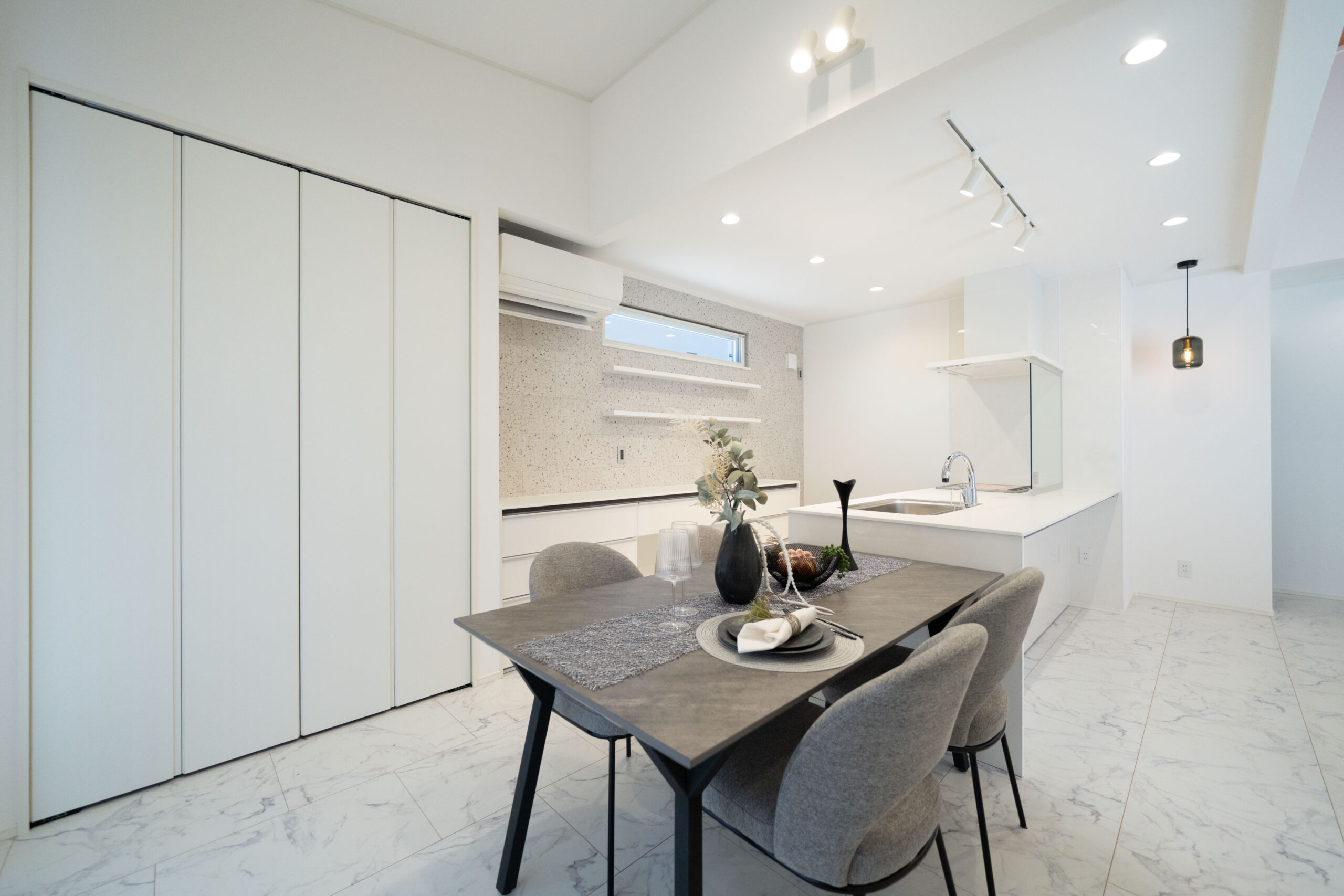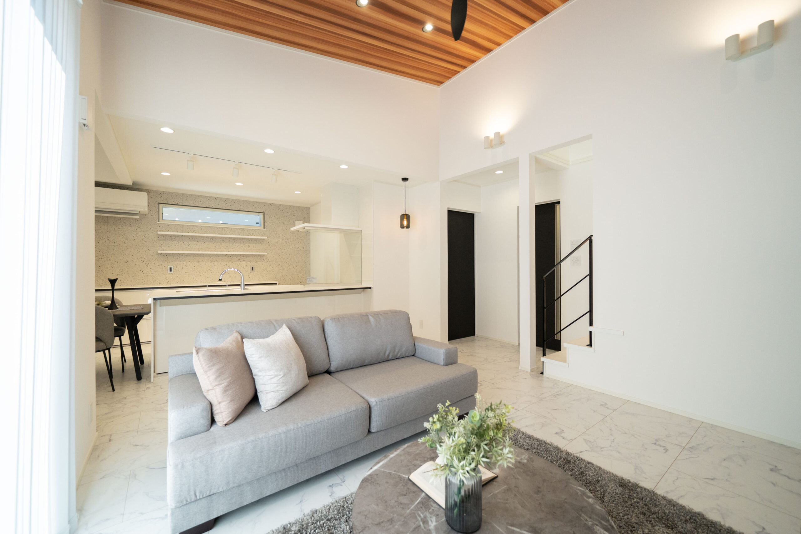 白とグレーでまとめたリビングは、ホテルのような上質さと落ち着きを感じる空間。床には永大産業の「コンカーボ」を採用し、上品な光沢とマーブル調のデザインがインテリアを一段と引き立てます。視線を上げると、木目の勾配天井がふわっと空間に広がりをつくり、自然と気持ちまで明るくなるような開放感を演出。やわらかな光が差し込む、くつろぎ時間を豊かにしてくれるリビングです。