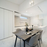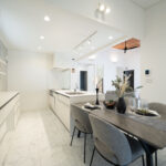 ダイニングとキッチンを横並びに配置し、配膳も片付けもスムーズにできる家事ラク動線を実現。キッチンはペニンシュラ型を採用し、リビングとの一体感とホテルのような高級感を両立しています。ダイニング上部はリビングとつながる勾配天井になっており、空間全体がのびやかにつながる気持ちの良さが魅力。家族との距離が近く、自然と会話が生まれるダイニングキッチンです。