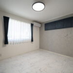白とグレーでまとめたリビングは、ホテルのような上質さと落ち着きを感じる空間。床には永大産業の「コンカーボ」を採用し、上品な光沢とマーブル調のデザインがインテリアを一段と引き立てます。視線を上げると、木目の勾配天井がふわっと空間に広がりをつくり、自然と気持ちまで明るくなるような開放感を演出。やわらかな光が差し込む、くつろぎ時間を豊かにしてくれるリビングです。