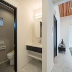脱衣室とは別に設けた独立洗面台は、入浴中でも気兼ねなく使える嬉しい設計。朝の支度や来客時にも使いやすく、家族みんなが気持ちよく過ごせる工夫が詰まっています。玄関からのアクセスも良く、帰宅後すぐに手洗いができる“ただいま動線”もしっかり確保。暮らしやすさを高めるポイントがぎゅっと詰まった洗面スペースです。