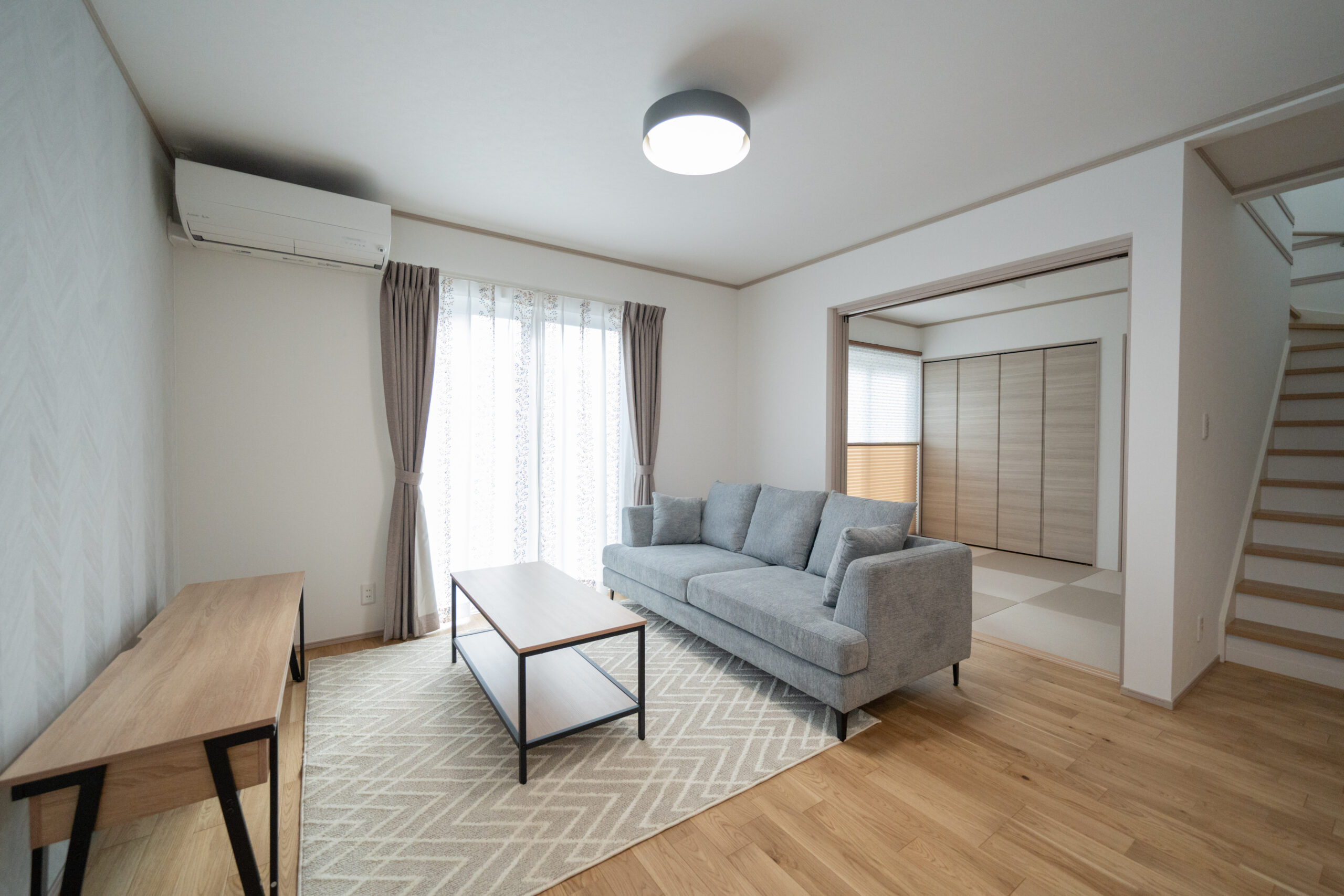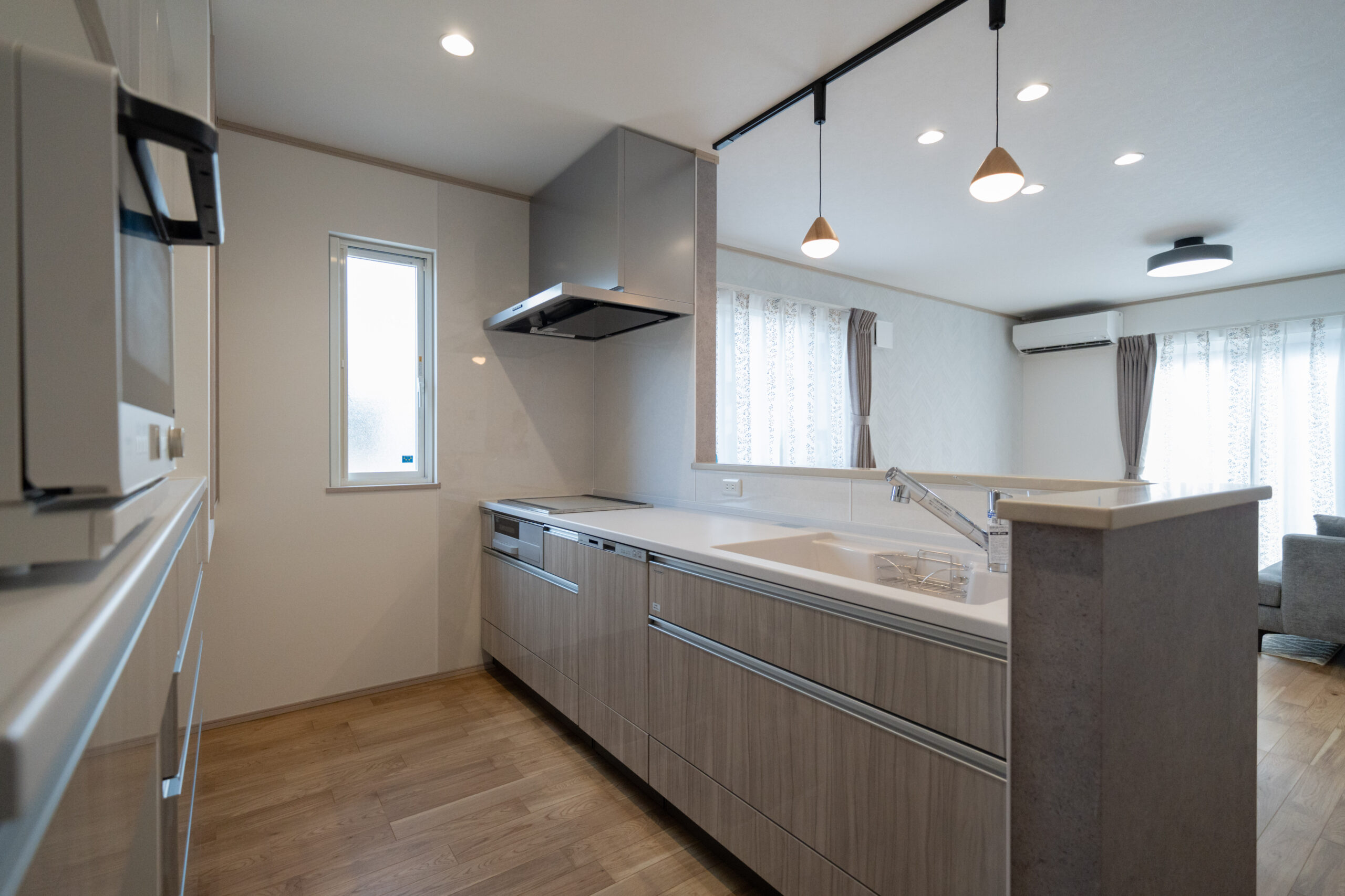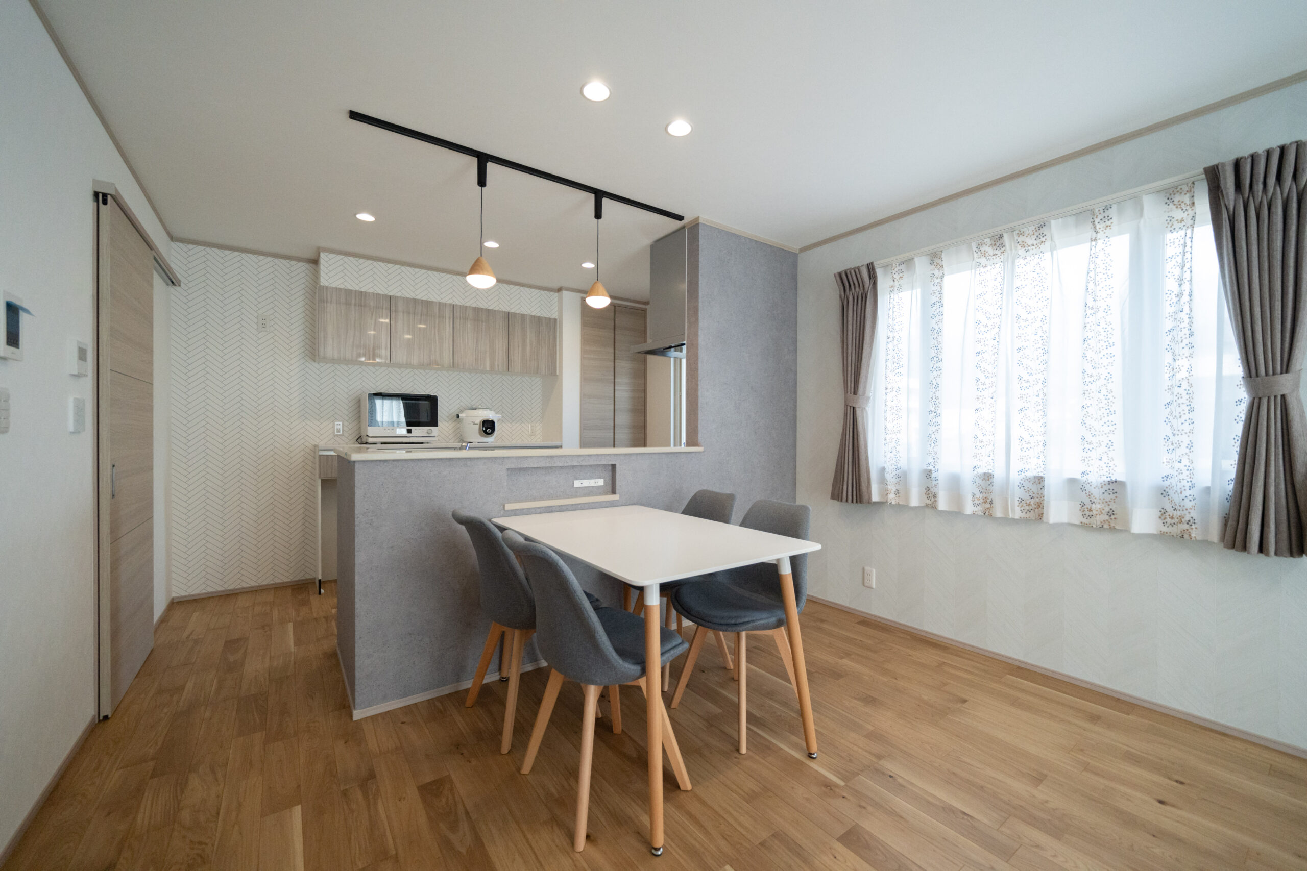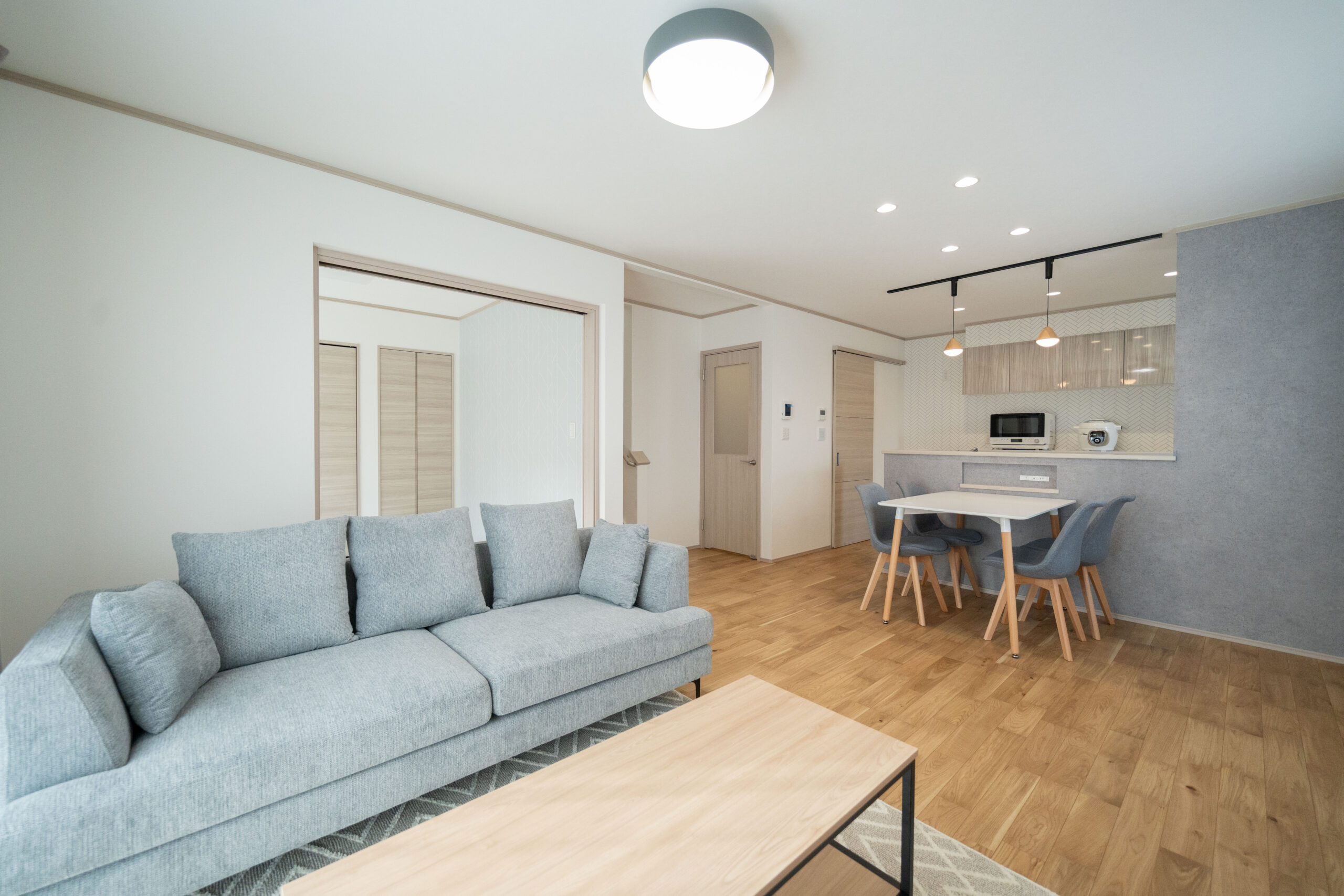 木目の温もりにグレーをアクセントとして取り入れた、やさしいノルディックテイストのLDK。リビング・ダイニング・キッチンが一直線に並んだ配置は、家族同士のコミュニケーションが取りやすく、日々の暮らしがよりスムーズになります。リビングに隣接した和室は、お子さまの遊び場にも、急な来客時のゲストルームにも活躍してくれる心強い空間です。
