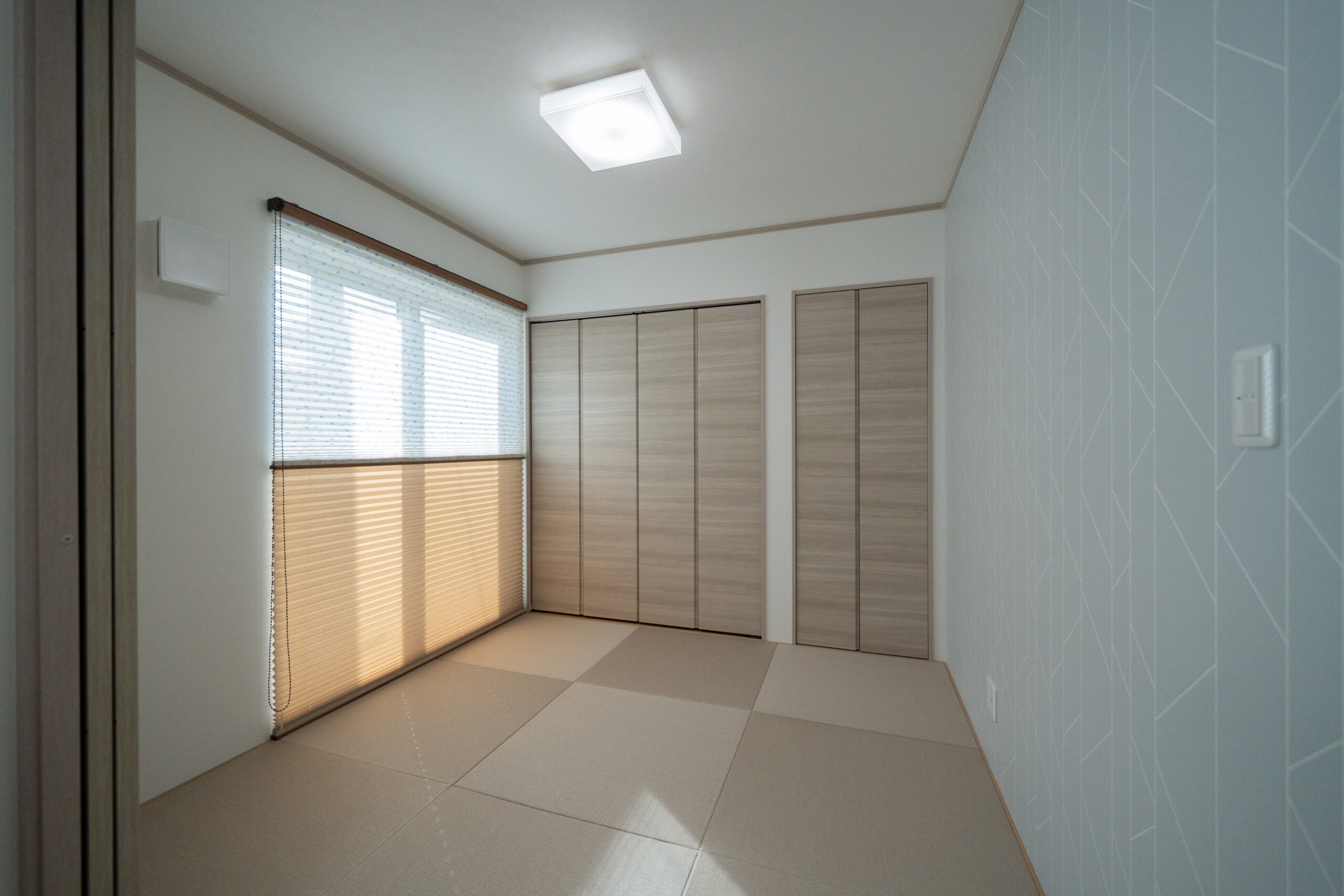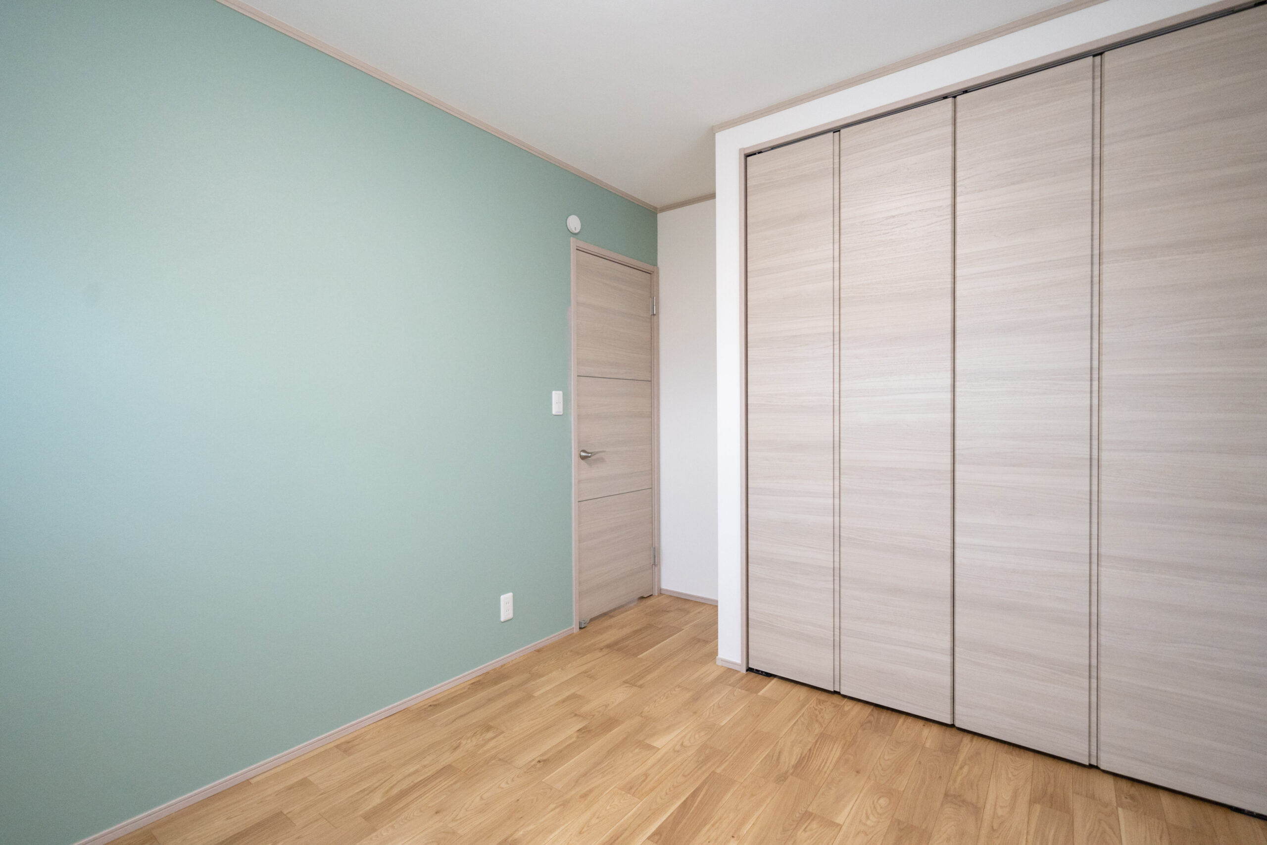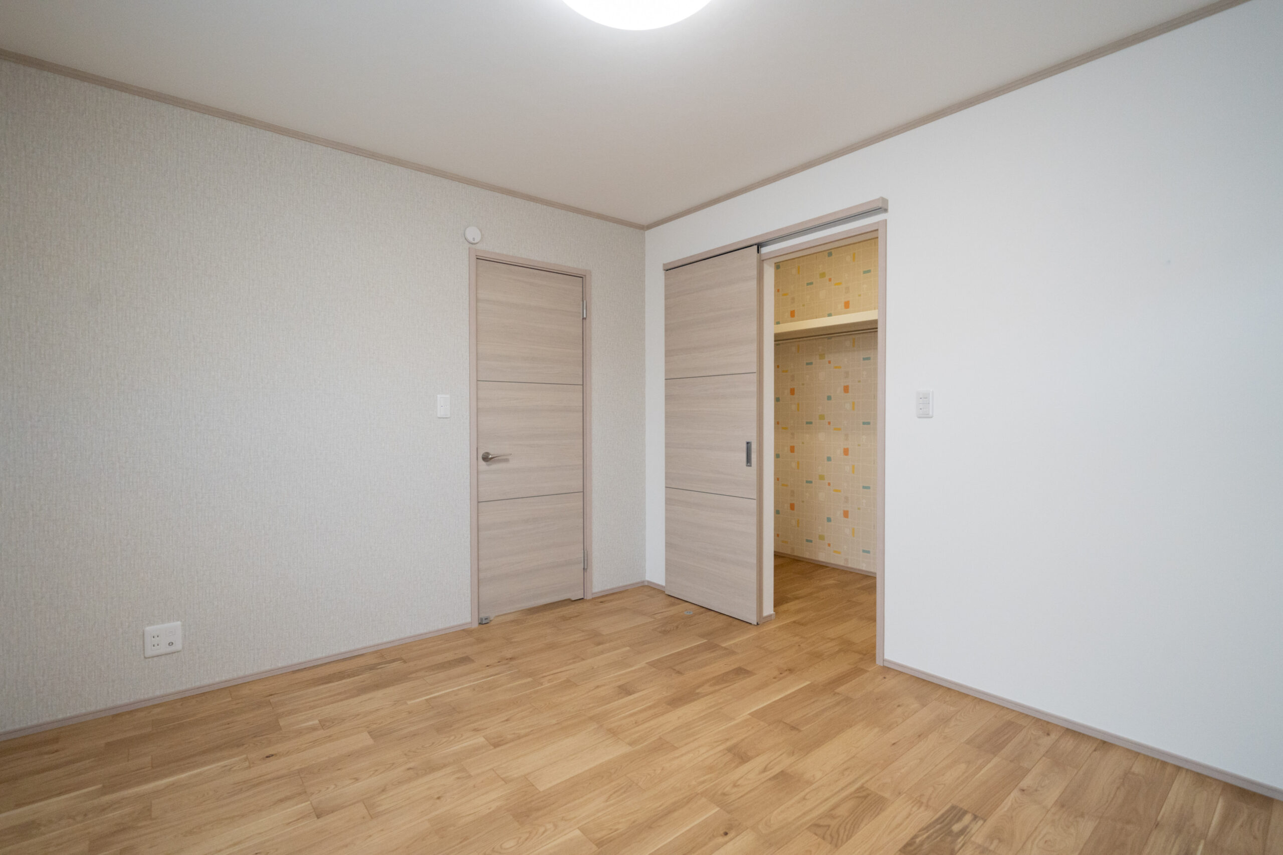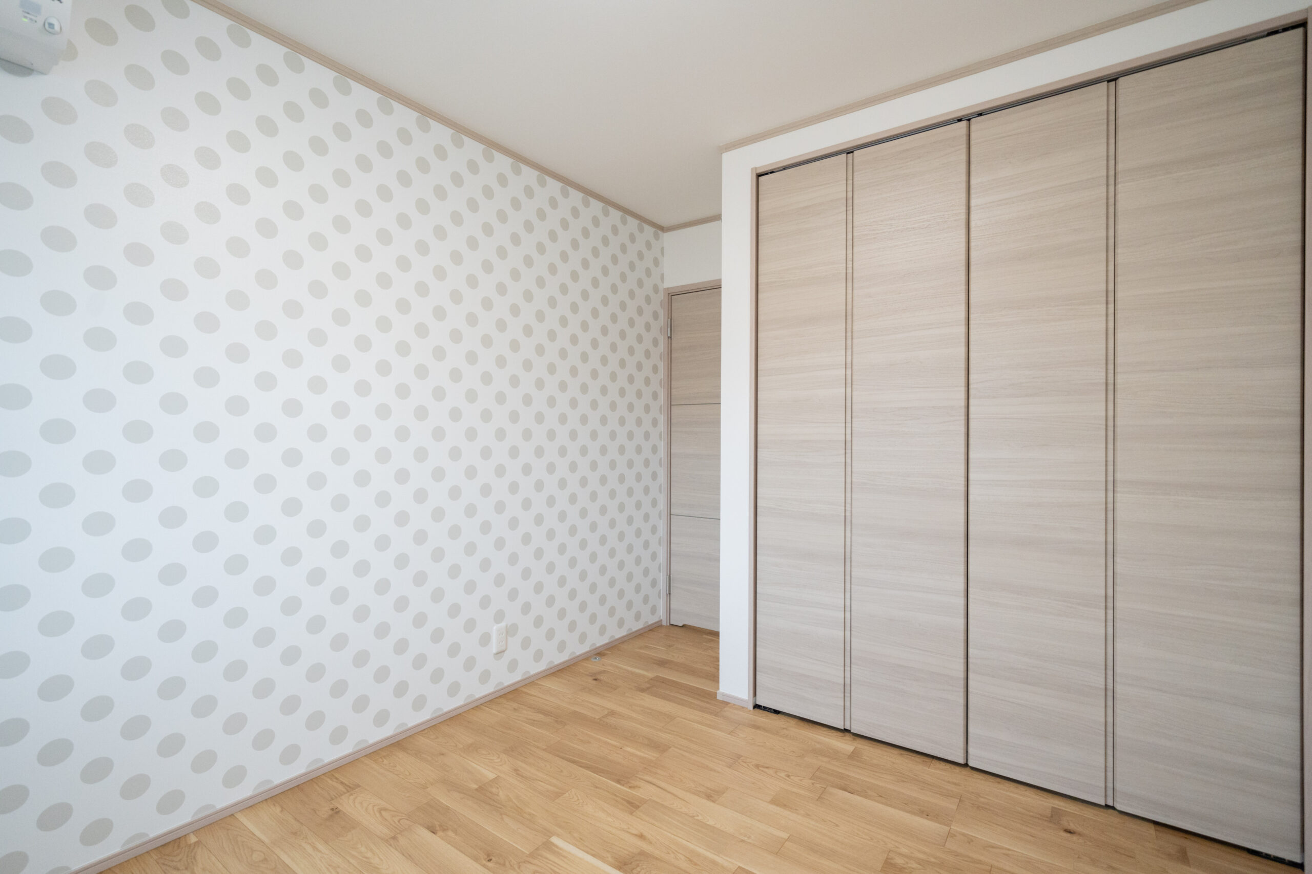 木目の温もりにグレーをアクセントとして取り入れた、やさしいノルディックテイストのLDK。リビング・ダイニング・キッチンが一直線に並んだ配置は、家族同士のコミュニケーションが取りやすく、日々の暮らしがよりスムーズになります。リビングに隣接した和室は、お子さまの遊び場にも、急な来客時のゲストルームにも活躍してくれる心強い空間です。