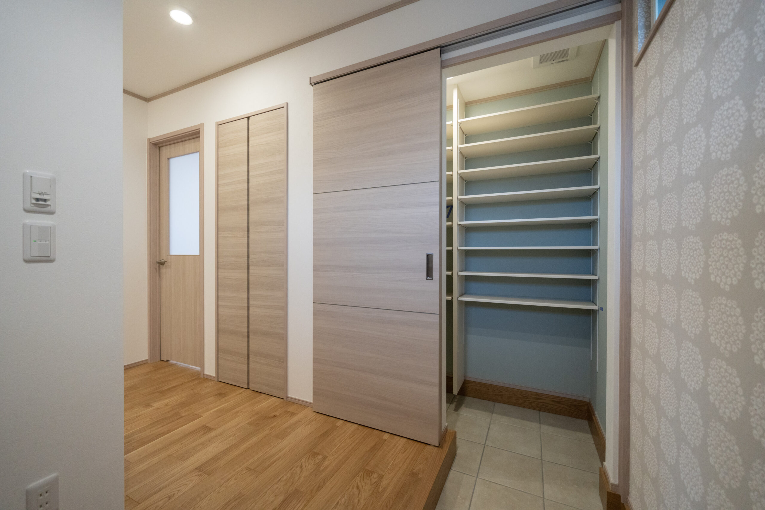 玄関には大容量の土間収納を設置し、靴はもちろん、ベビーカーやアウトドア用品などもすっきり収まります。ホールからはリビング、キッチン、洗面へとアクセスできるため、帰宅後の動線がとてもスムーズ。家族の “毎日のラクさ” をしっかり支える間取りになっています。