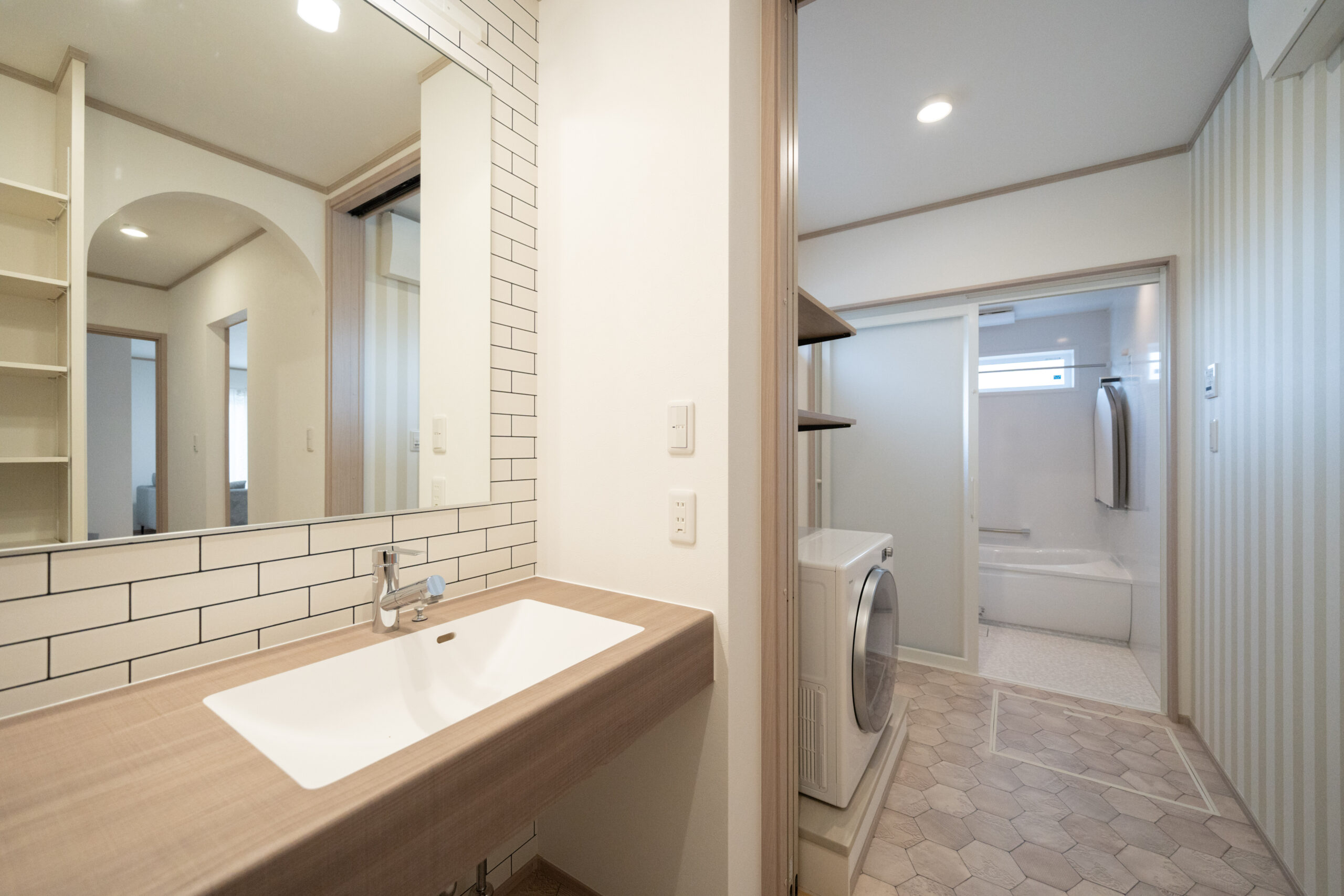 洗面台と脱衣室を分けたことで、家族の入浴中でも気兼ねなく洗面台を使える使いやすい設計。脱衣室には乾太くんを備えており、「洗う・乾かす・しまう」が一箇所で完結する家事ラク動線を実現しています。洗面台はアイカ工業の造作風デザインを採用し、見た目の良さと使い勝手の両方を叶えています。