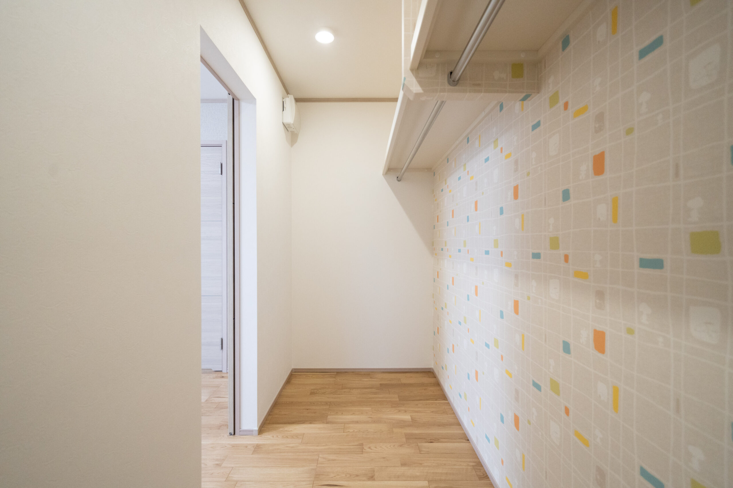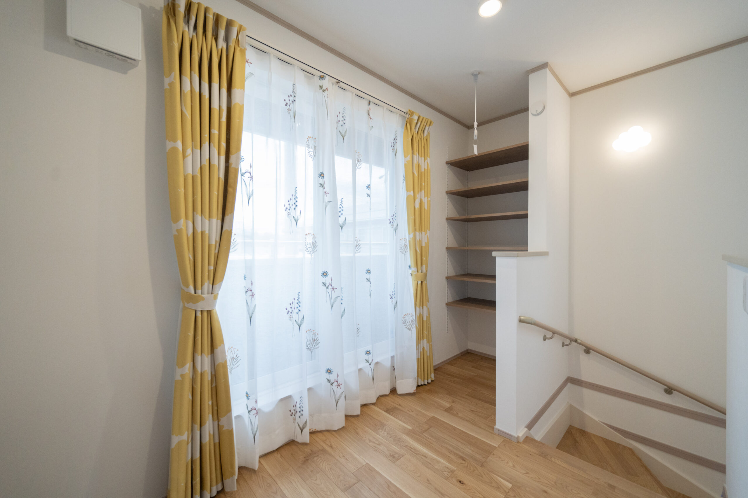 2階ホールに設けた室内物干しスペースは、天気に左右されず快適に洗濯物を干せる便利な場所。日当たりも良く、来客時にも視線を気にせず干せるため、忙しい子育て世帯にとって心強いスペースです。