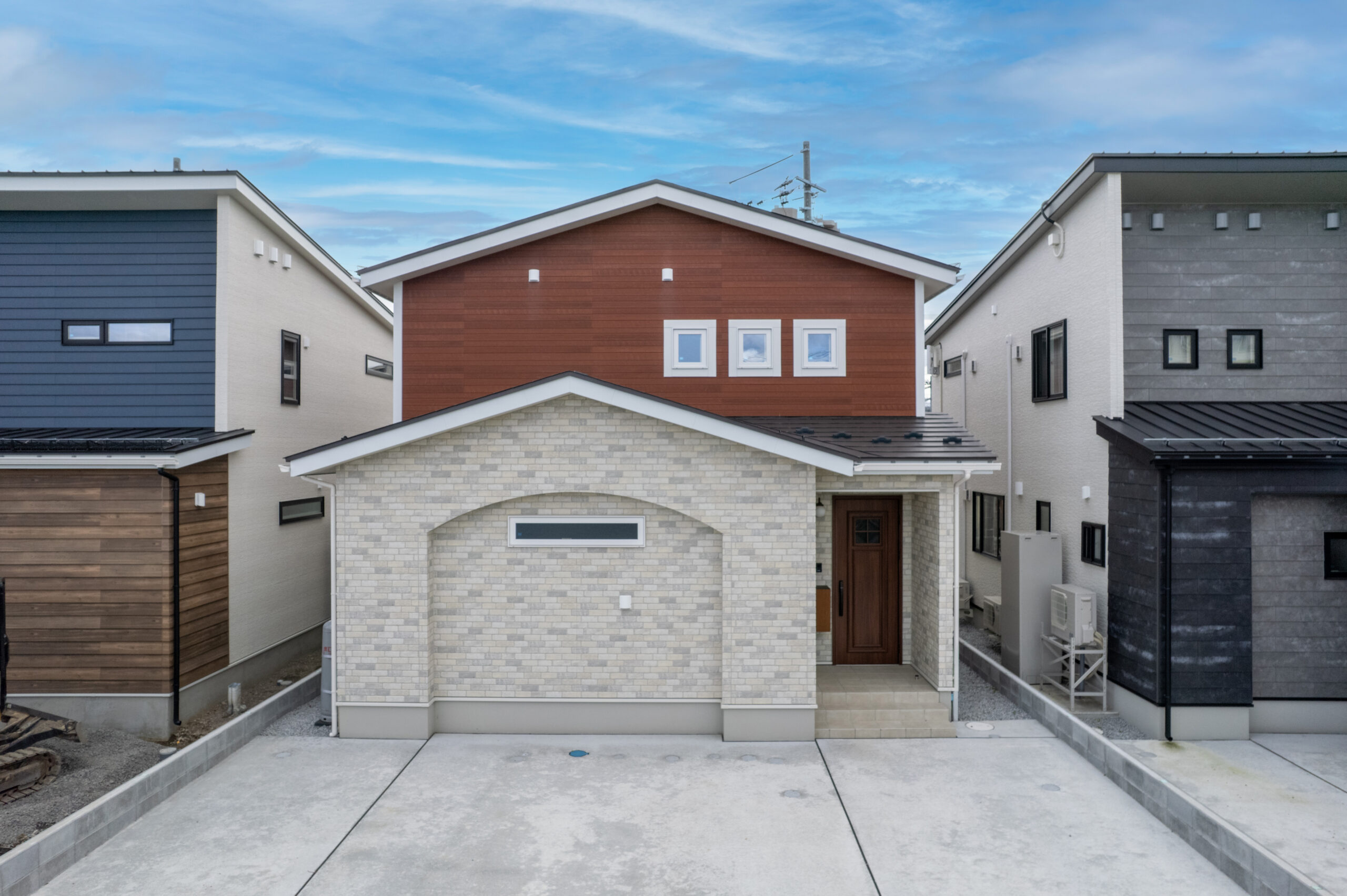 上下で貼り分けたノルディックスタイルの外観は、柔らかなトーンの石目調とテラコッタ色の木目がバランスよく調和し、かわいらしさと温かみを感じるデザインに仕上がっています。上部の小窓にはモール枠をあしらい、北欧らしいアクセントに。三角屋根が街並みにやさしく馴染みながら、個性もしっかりと感じられる外観です。