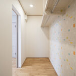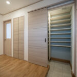 玄関には大容量の土間収納を設置し、靴はもちろん、ベビーカーやアウトドア用品などもすっきり収まります。ホールからはリビング、キッチン、洗面へとアクセスできるため、帰宅後の動線がとてもスムーズ。家族の “毎日のラクさ” をしっかり支える間取りになっています。