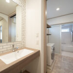 洗面台と脱衣室を分けたことで、家族の入浴中でも気兼ねなく洗面台を使える使いやすい設計。脱衣室には乾太くんを備えており、「洗う・乾かす・しまう」が一箇所で完結する家事ラク動線を実現しています。洗面台はアイカ工業の造作風デザインを採用し、見た目の良さと使い勝手の両方を叶えています。