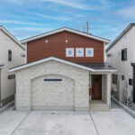 上下で貼り分けたノルディックスタイルの外観は、柔らかなトーンの石目調とテラコッタ色の木目がバランスよく調和し、かわいらしさと温かみを感じるデザインに仕上がっています。上部の小窓にはモール枠をあしらい、北欧らしいアクセントに。三角屋根が街並みにやさしく馴染みながら、個性もしっかりと感じられる外観です。