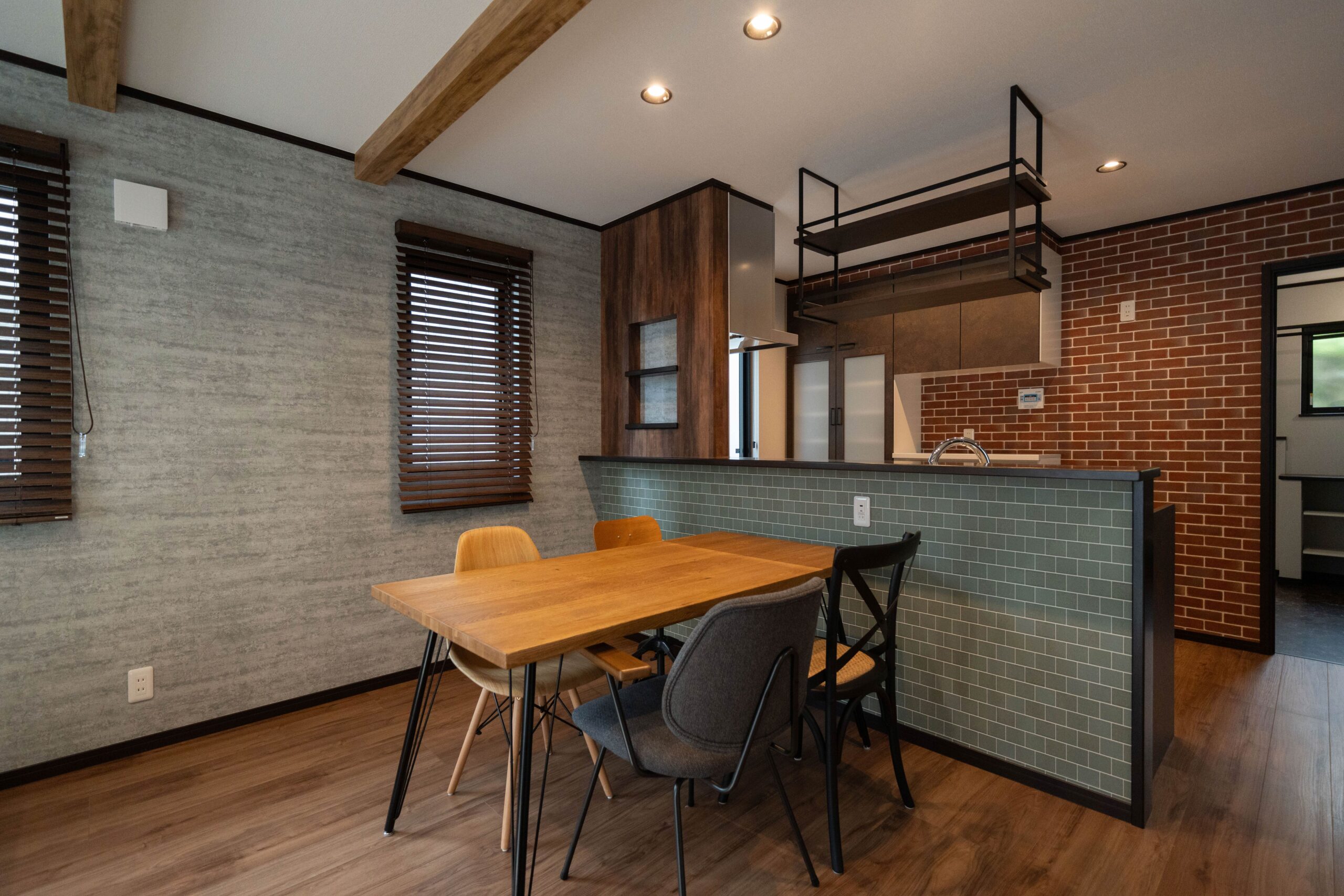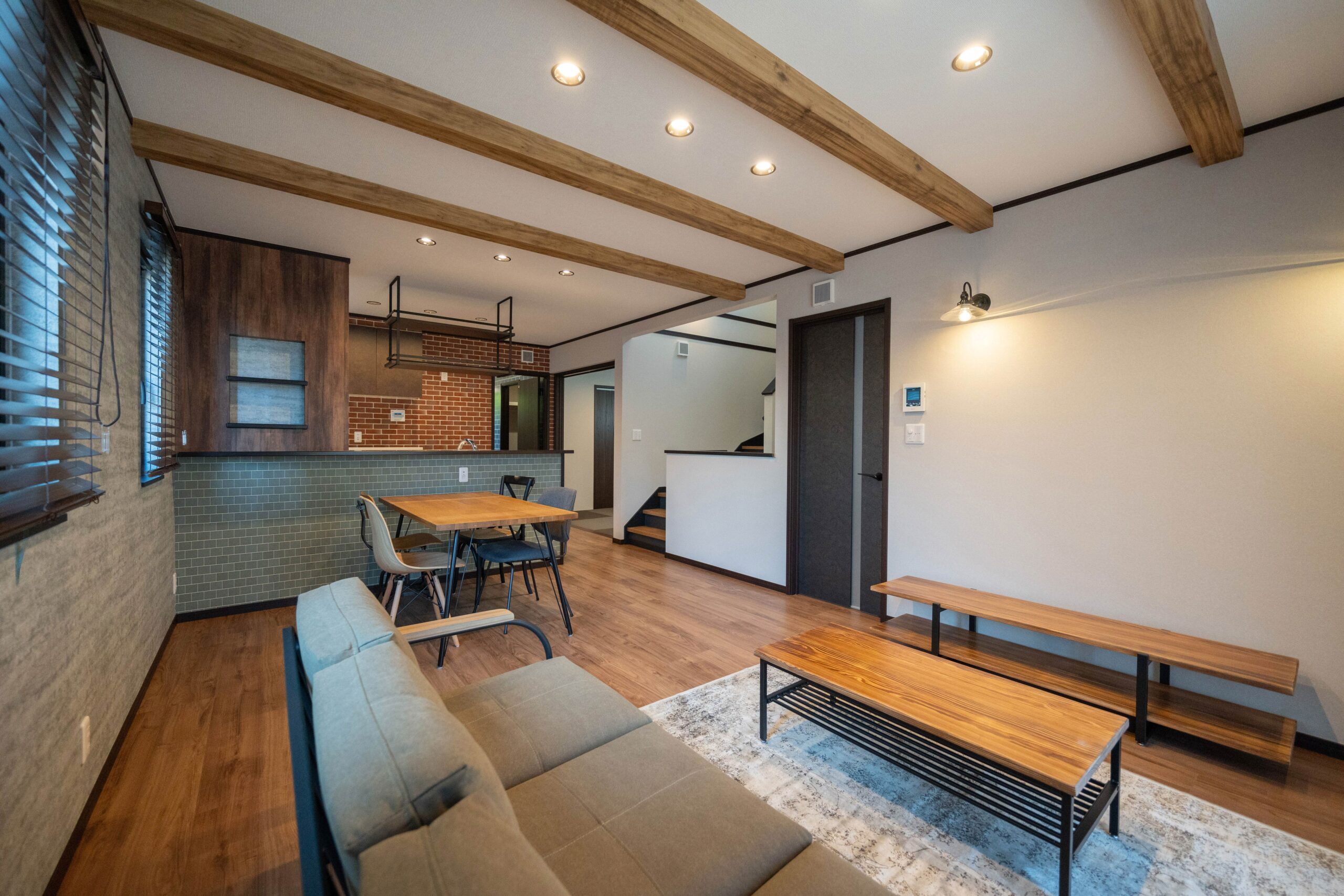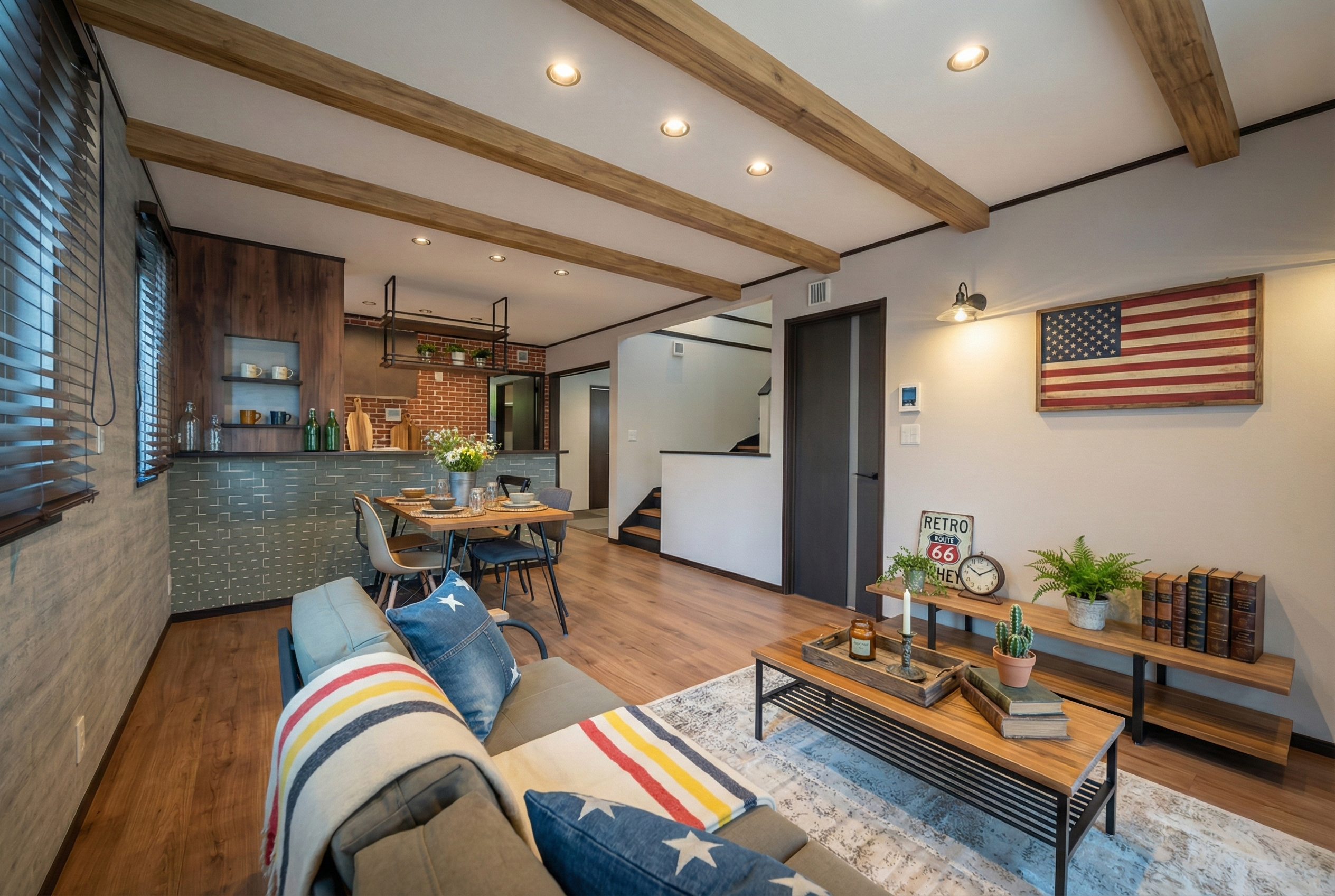 木目の飾り梁やレンガ調のキッチン壁が印象的な、ヴィンテージ感あふれるLDKです。落ち着いたトーンでまとめつつ、素材の存在感がしっかり感じられるアメリカンカジュアルな雰囲気が魅力。リビング・ダイニング・キッチンが一直線に配置されているので、家族の気配をいつも近くに感じながら過ごせます。無骨さとあたたかさが心地よく混ざり合った空間に仕上がっています。