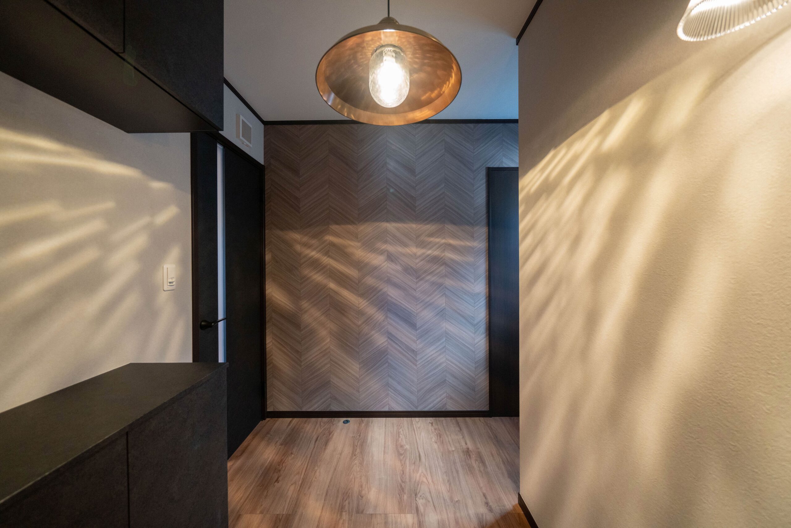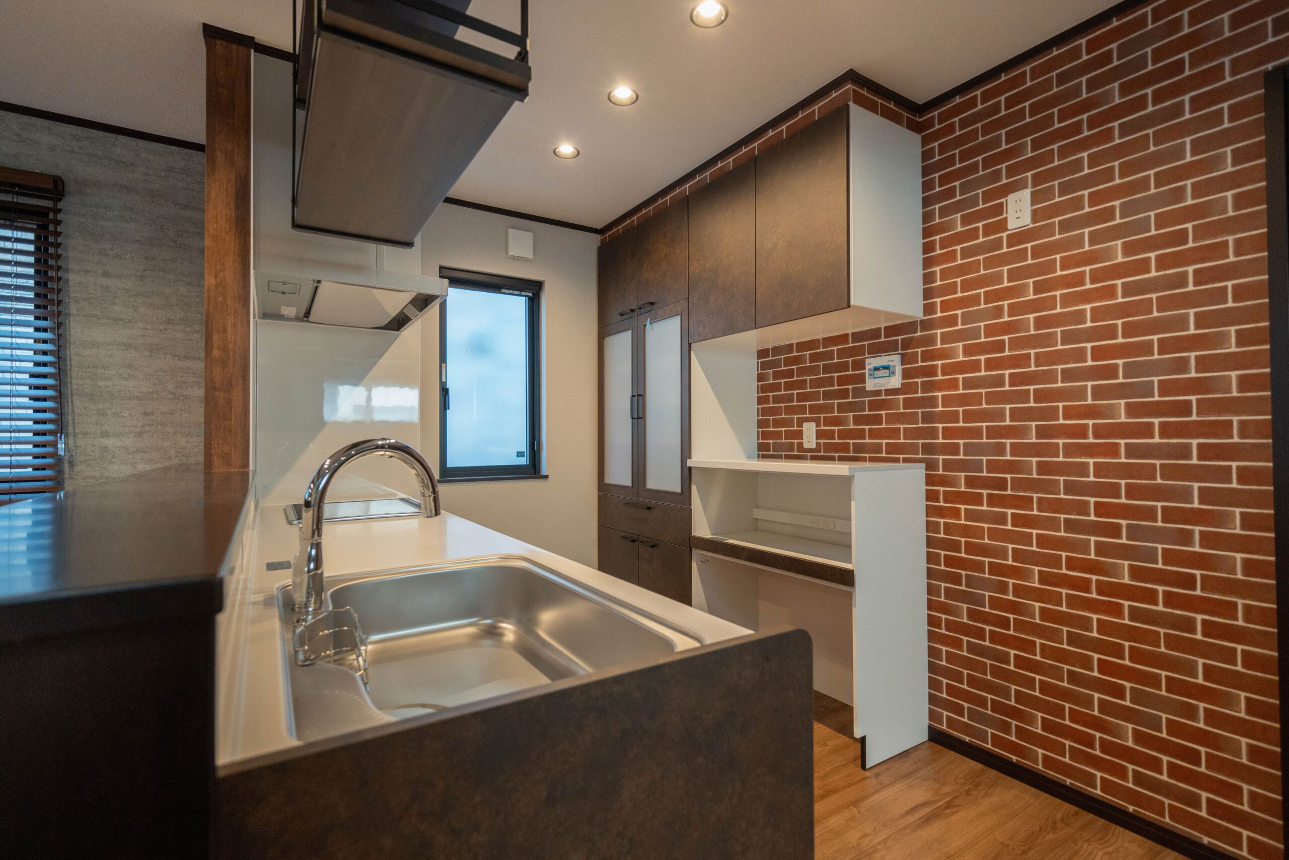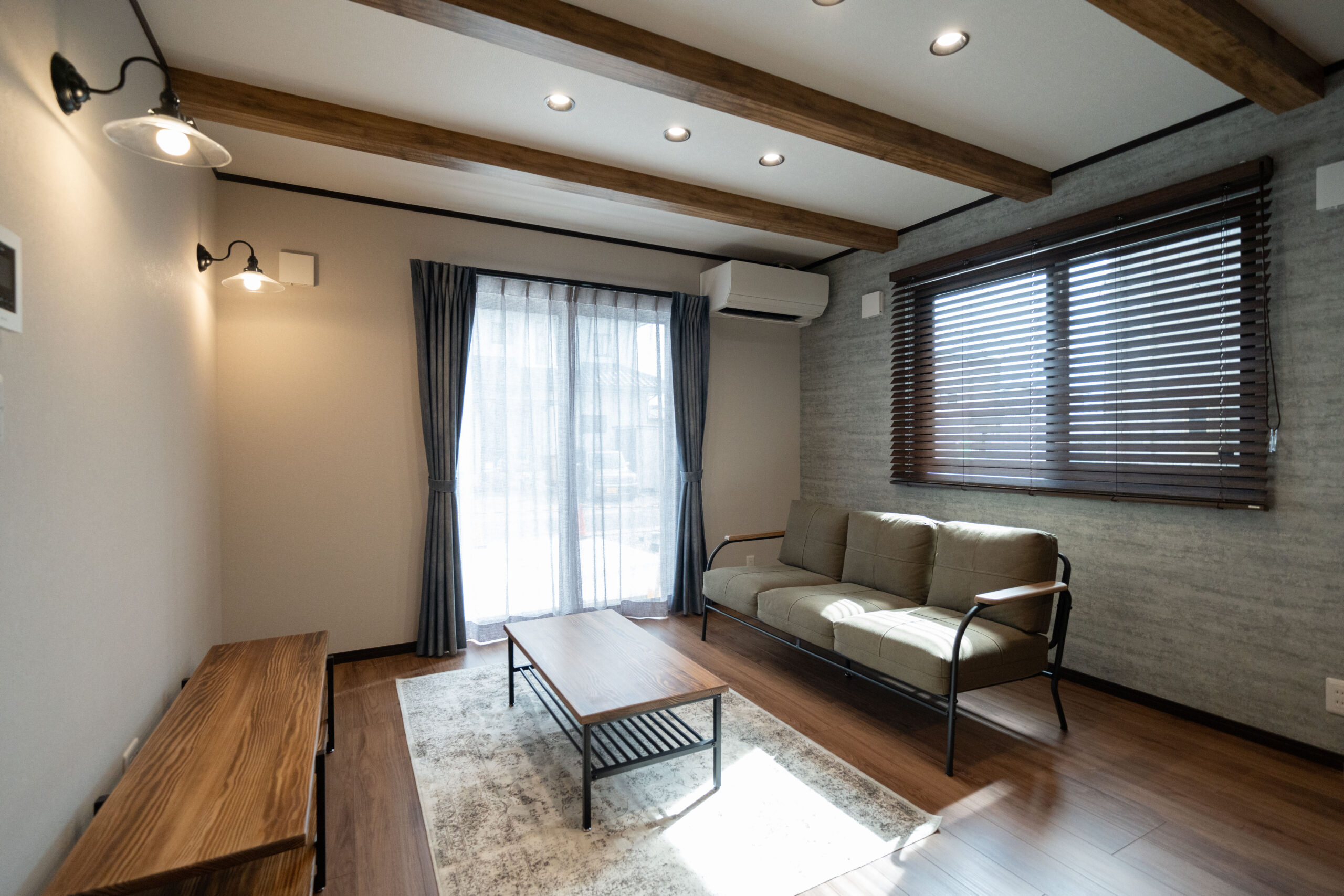 木目の飾り梁やレンガ調のキッチン壁が印象的な、ヴィンテージ感あふれるLDKです。落ち着いたトーンでまとめつつ、素材の存在感がしっかり感じられるアメリカンカジュアルな雰囲気が魅力。リビング・ダイニング・キッチンが一直線に配置されているので、家族の気配をいつも近くに感じながら過ごせます。無骨さとあたたかさが心地よく混ざり合った空間に仕上がっています。